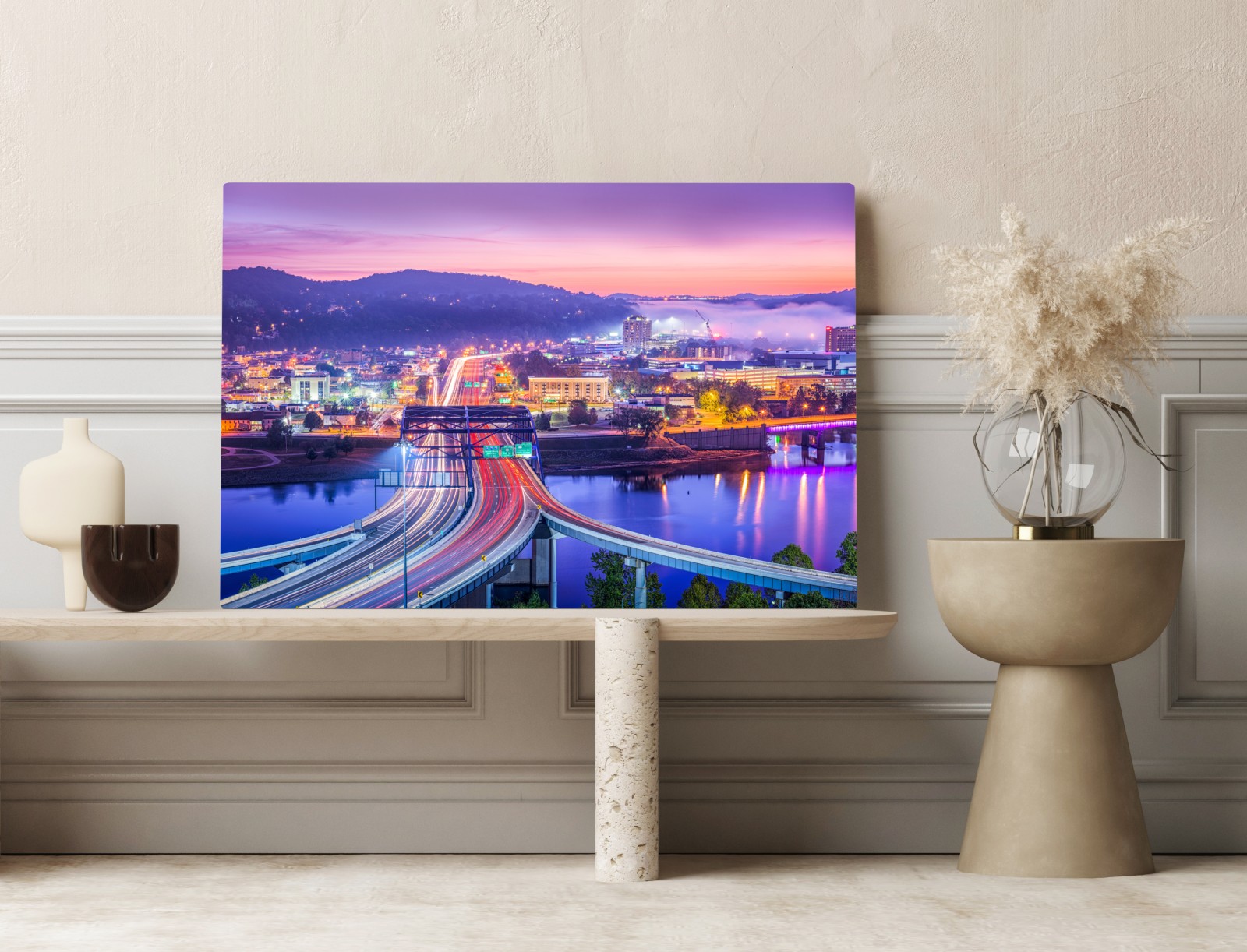 Odkryj spokojne piękno Charleston o świcie na tym żywym wydruku miejskim z mostem, światłami i pastelowym niebem.WięcejMniej