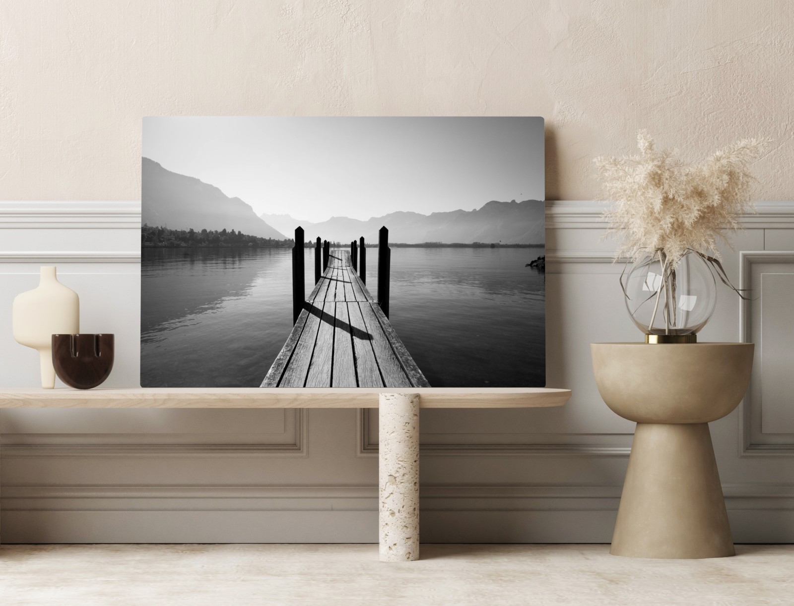 Obraz na płótnie Spokojny pomost nad jeziorem w czerni i bieli
