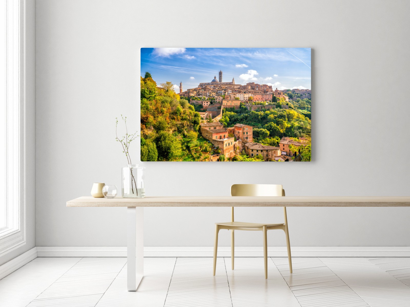 Poczuj ponadczasowy urok Sieny dzięki tej żywej panoramicznej scenerii zabytkowego centrum i zielonych toskańskich wzgórz.WięcejMniej