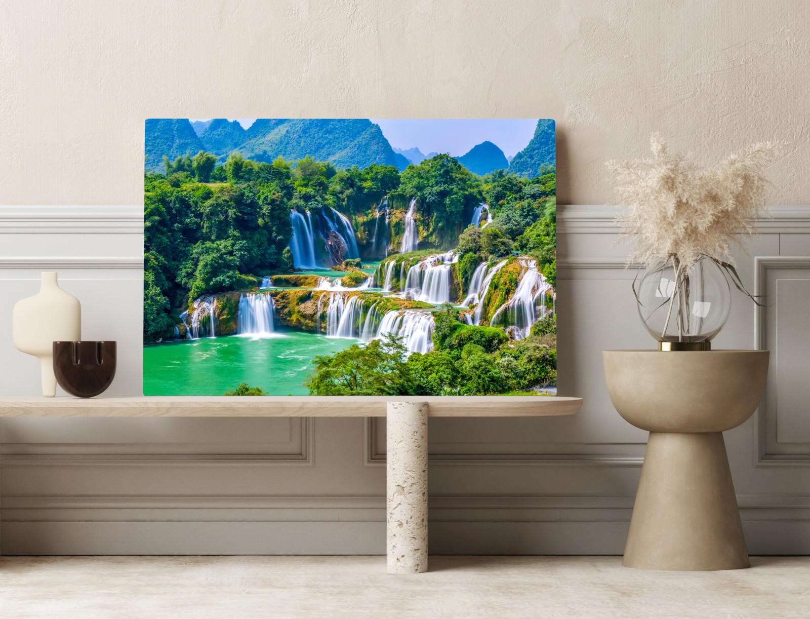 Poczuj kojącą energię spadających wodospadów w bujnych zielonych górach, które wprowadzają odświeżający, naturalny akcent do każdego wnętrza.WięcejMniej