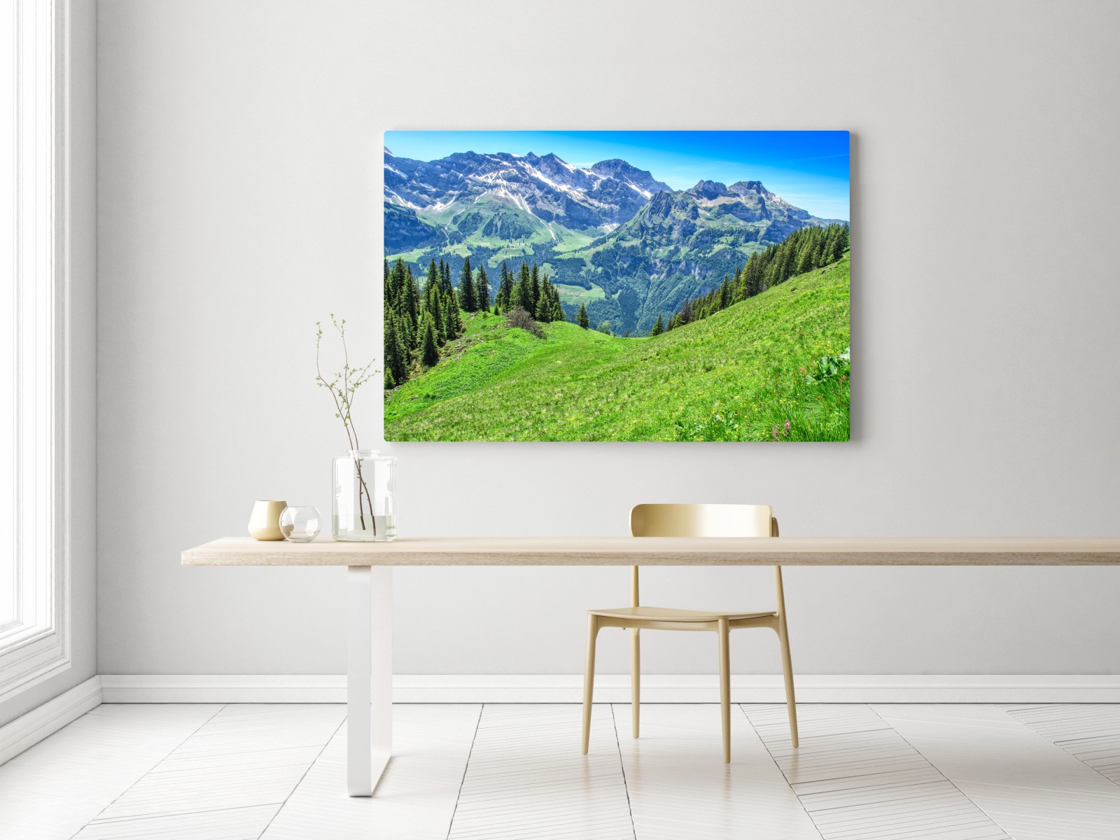 Wprowadź spokojne piękno Szwajcarskich Alp do wnętrza dzięki tej żywej panoramicznej fotografii ukazującej bujne łąki, surowe szczyty i czyste letnie niebo.WięcejMniej