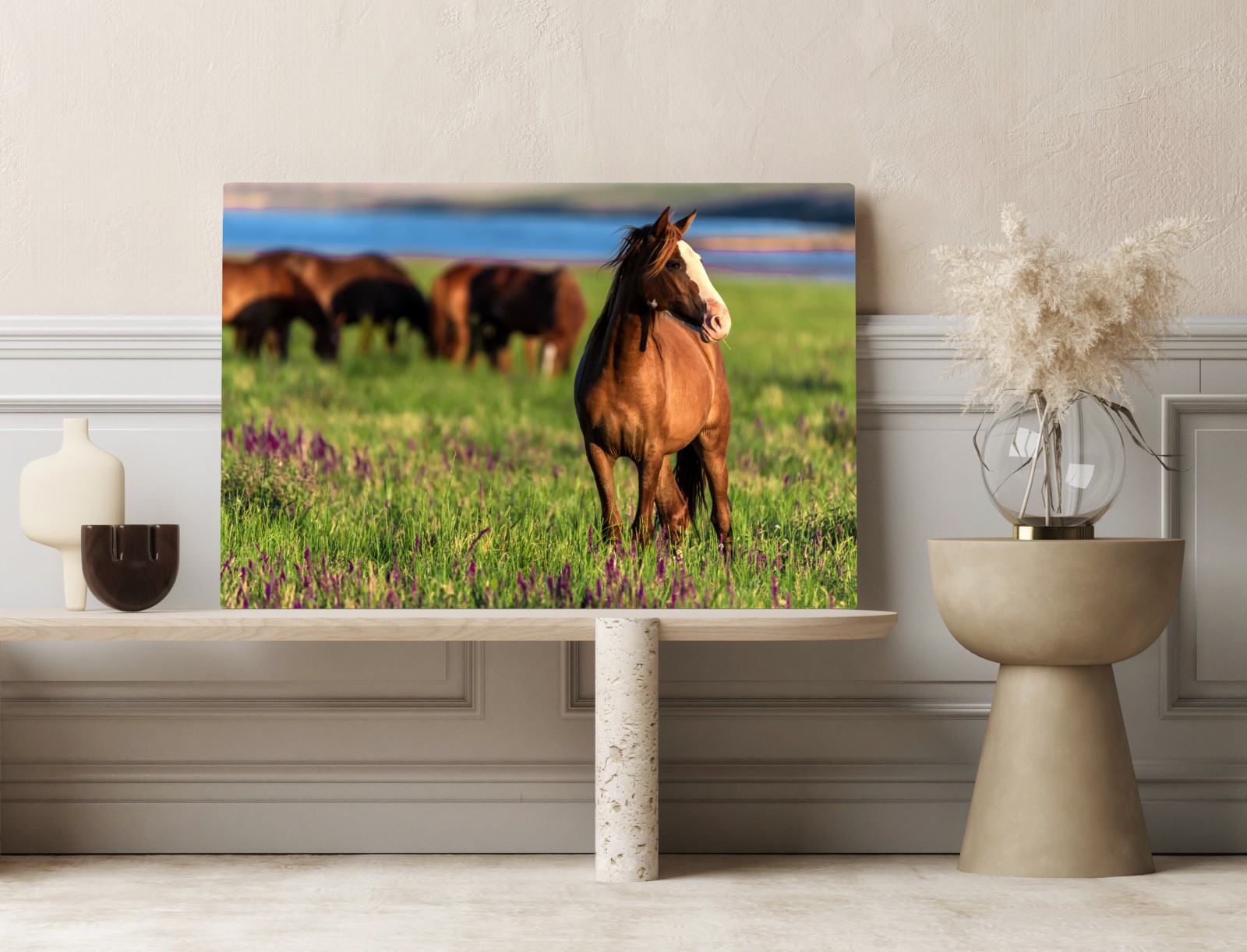 Obraz na płótnie Majestatyczny brązowy koń na słonecznej łące