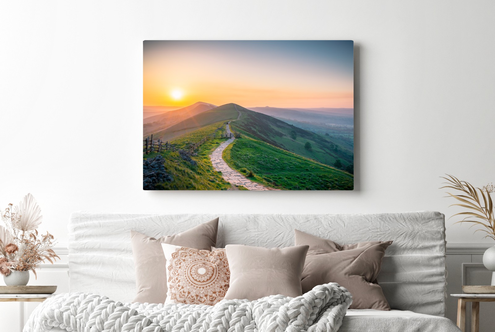 Obraz na płótnie Wschód słońca nad zielonymi wzgórzami z kamienną ścieżką