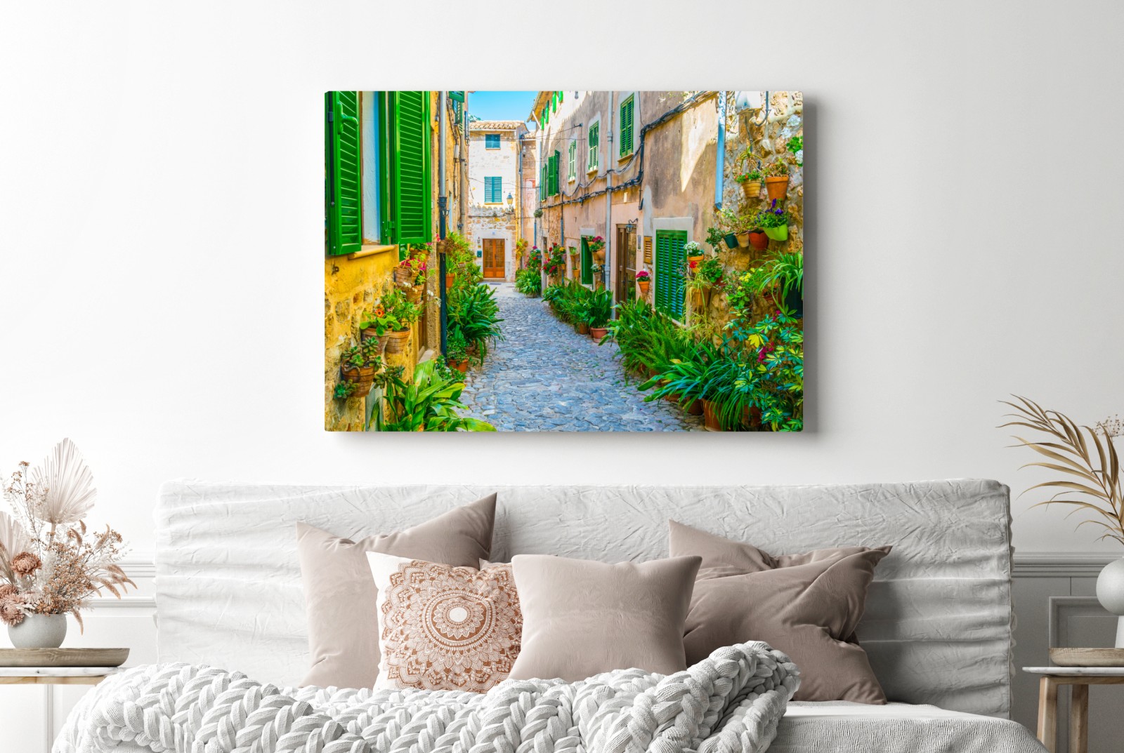 Obraz na płótnie Słoneczna uliczka z zielonymi okiennicami