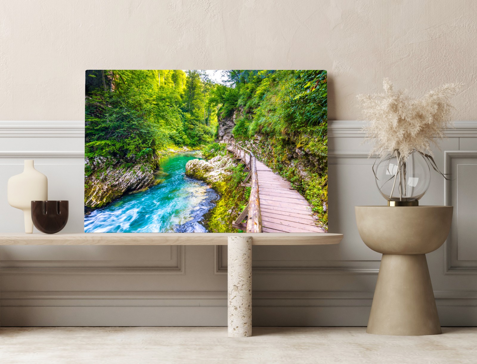 Wprowadź do wnętrza spokój natury dzięki temu żywemu obrazowi przedstawiającemu turkusową rzekę i drewnianą ścieżkę wśród bujnej zieleni.WięcejMniej