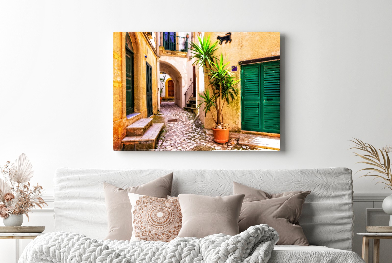 Obraz na płótnie Słoneczna śródziemnomorska uliczka z zielonymi okiennicami
