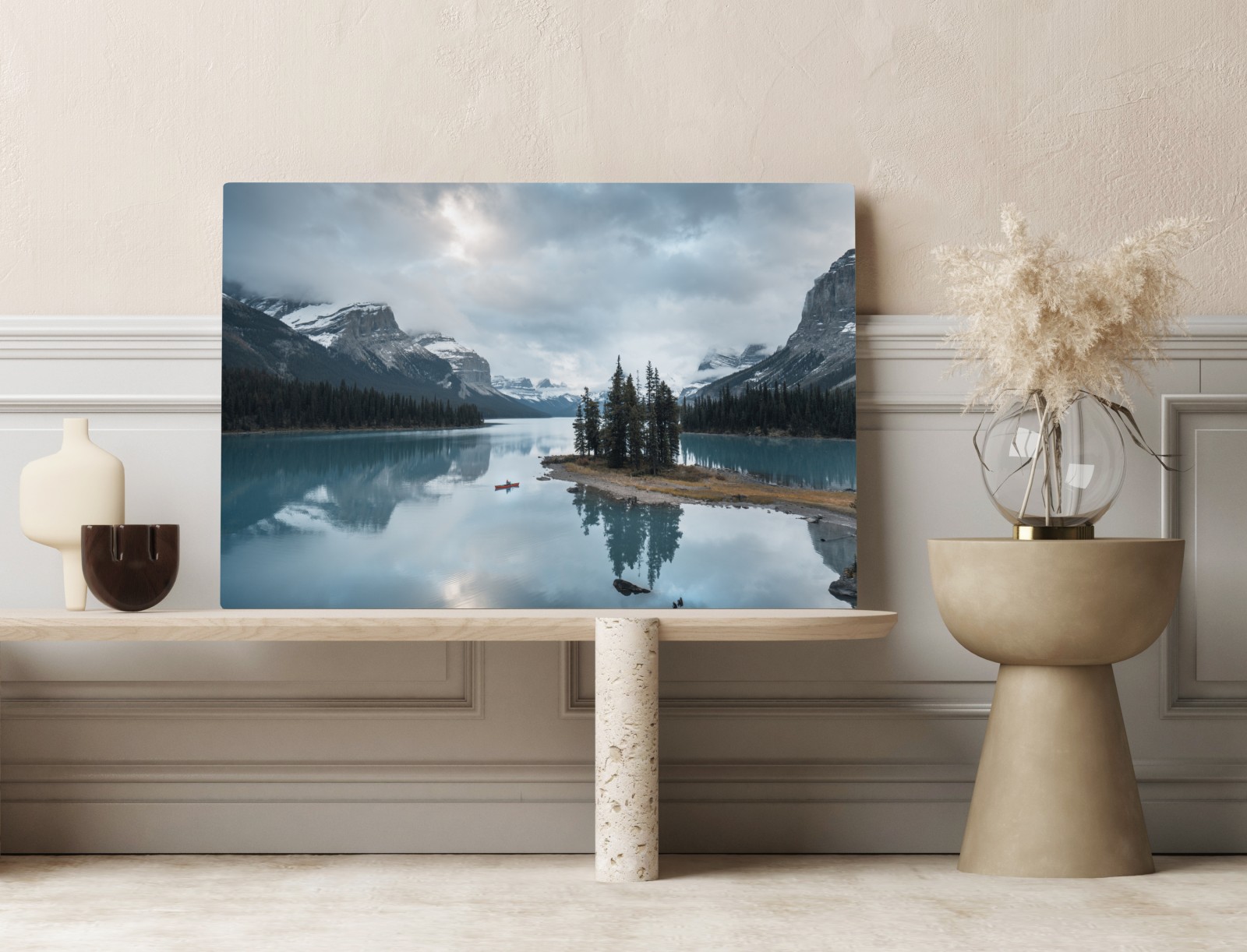 Obraz na płótnie Spokojne alpejskie jezioro z wyspą i kajakiem