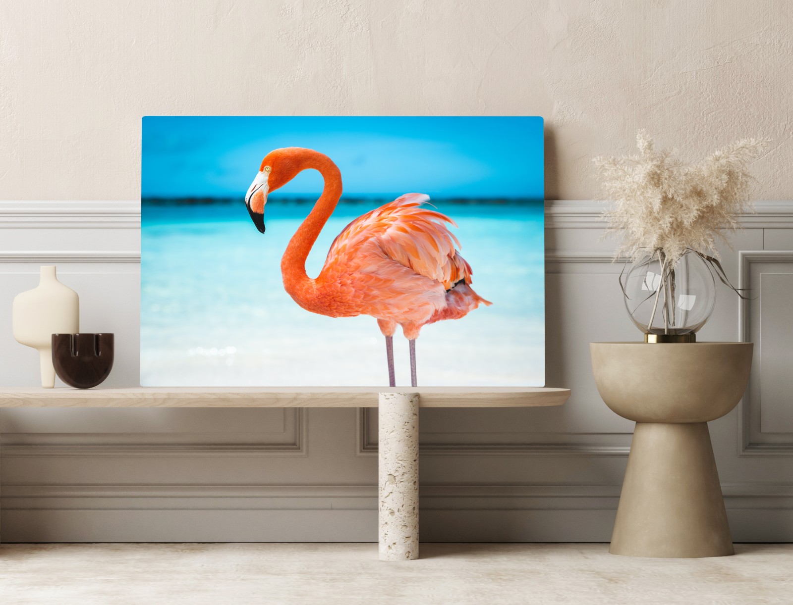 Wprowadź tropikalny klimat do wnętrza dzięki żywemu różowemu flamingowi na turkusowym tle morza. Idealny do salonu, sypialni i pokoju dziecięcego.WięcejMniej