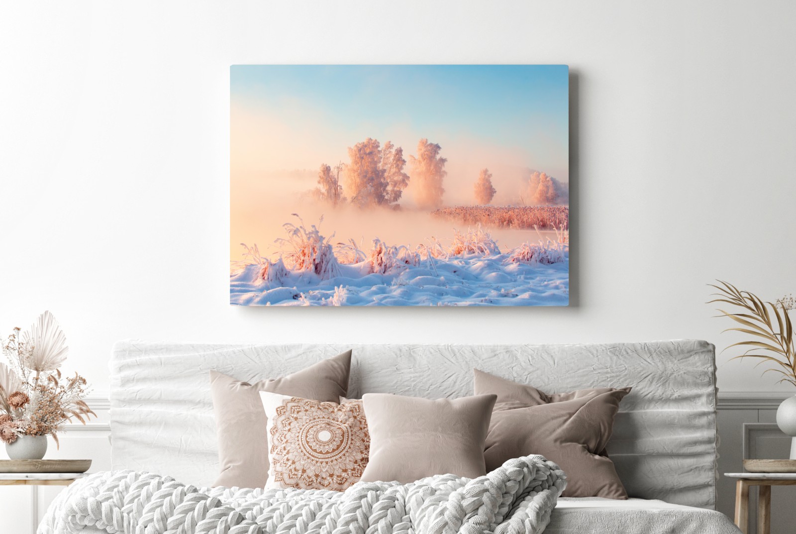 Obraz na płótnie Zimowy wschód słońca nad oszronioną łąką
