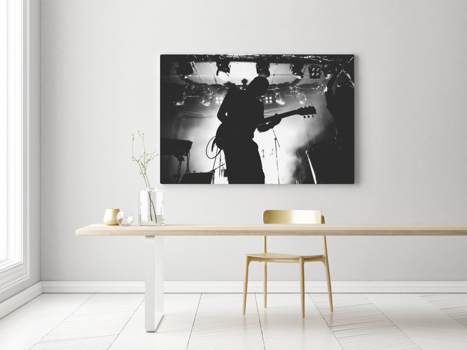 Dodaj energii swojej ścianie dzięki tej wyrazistej czarno-białej sylwetce gitarzysty, idealnej do stworzenia mocnej atmosfery.WięcejMniej