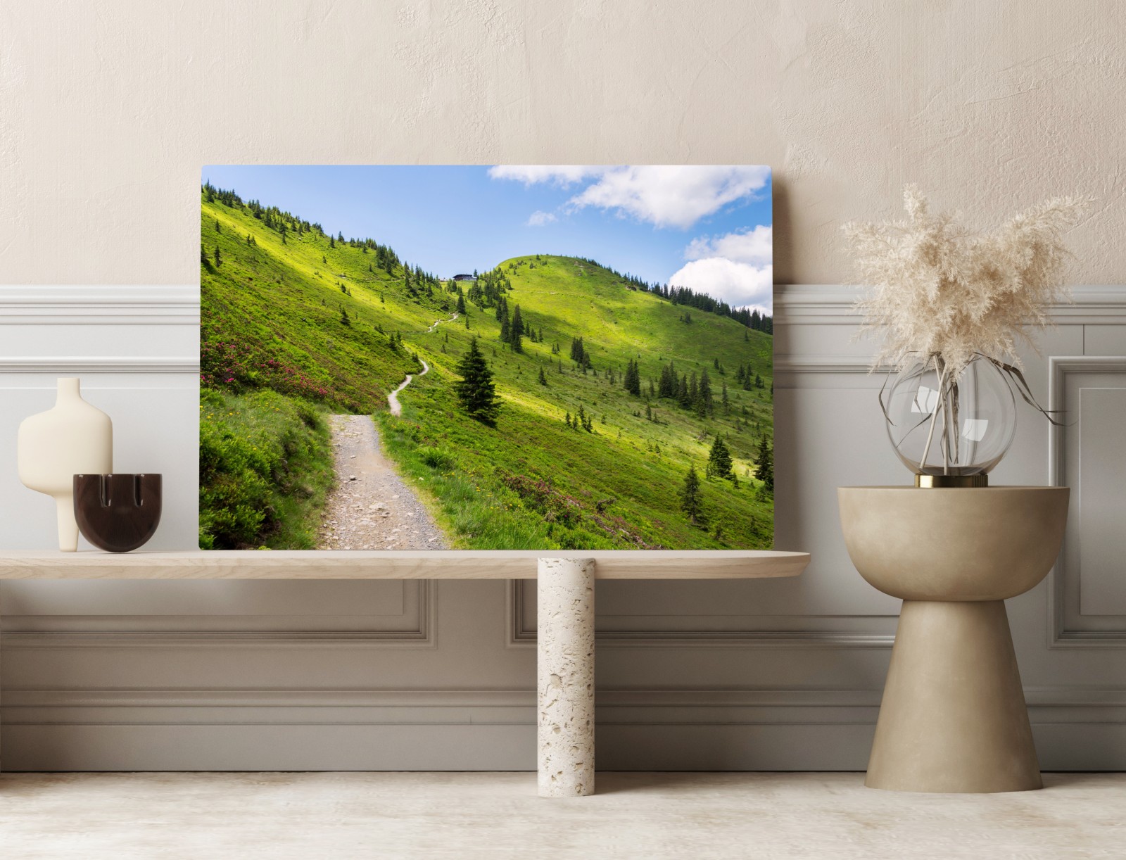 Obraz na płótnie Słoneczna górska ścieżka przez zieloną łąkę