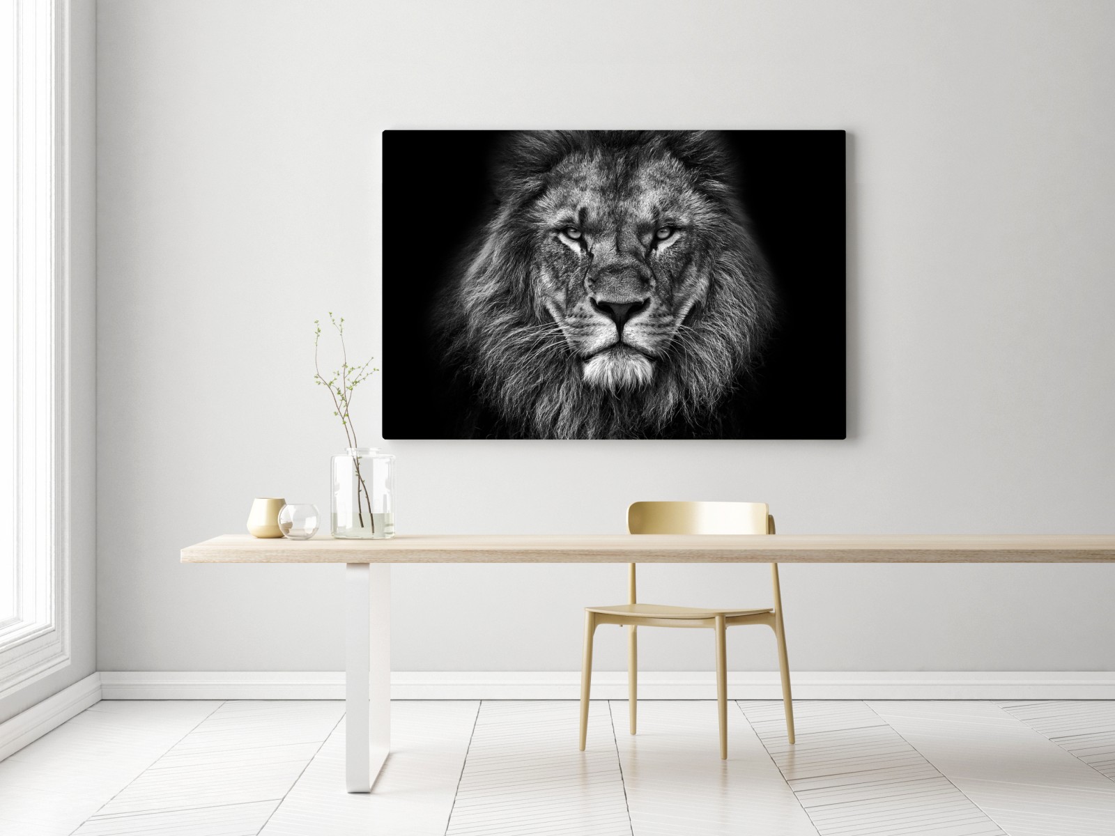 Dodaj dramatycznej elegancji do wnętrza dzięki temu wyrazistemu, czarno-białemu portretowi lwa idealnemu do nowoczesnych przestrzeni.WięcejMniej