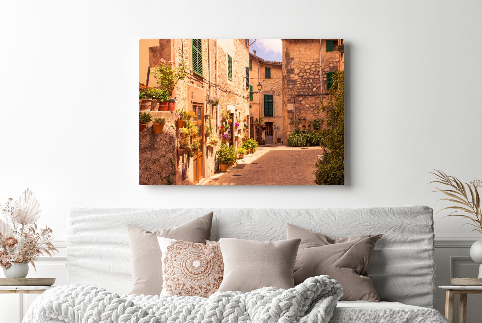 Obraz na płótnie Słoneczna uliczka śródziemnomorska z doniczkami