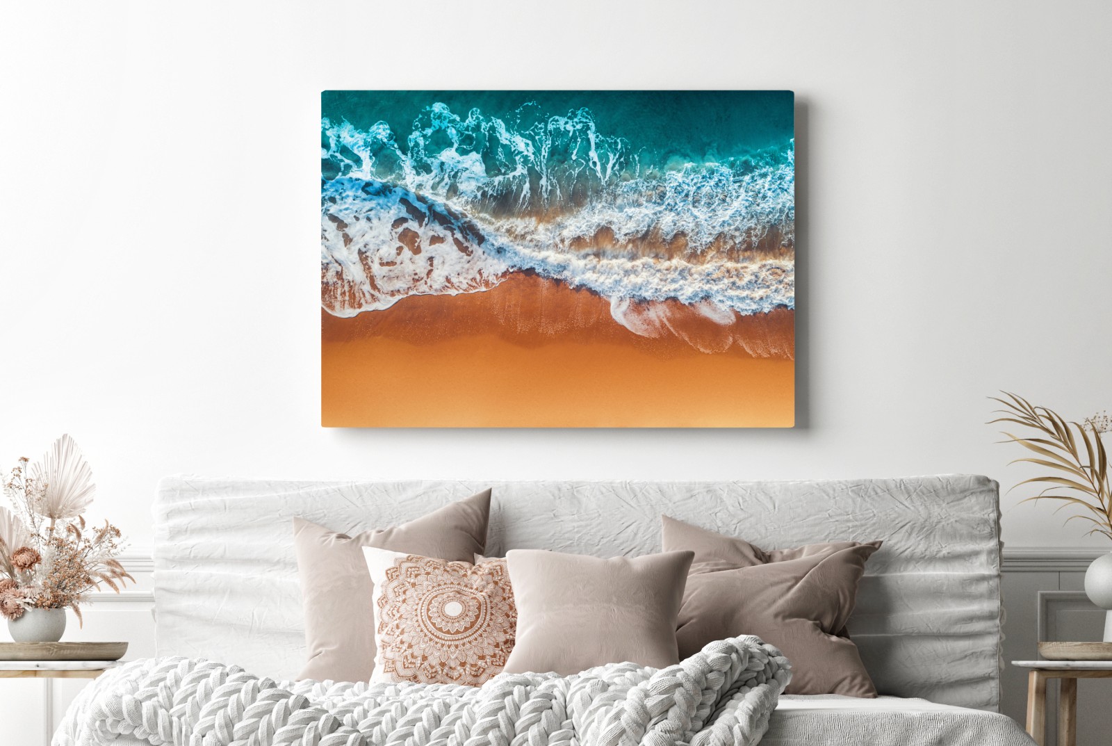 Wprowadź kojący nadmorski klimat do wnętrza dzięki lotniczemu ujęciu turkusowych fal rozbijających się o złocisty piasek.WięcejMniej