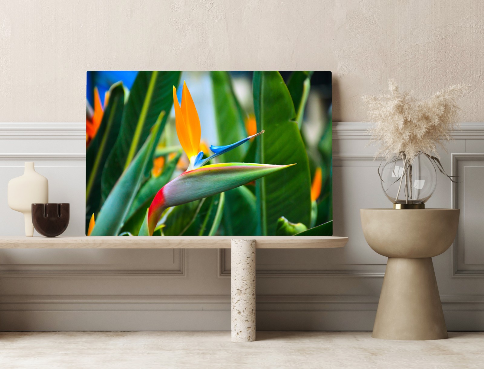 Wprowadź tropikalną energię do wnętrza dzięki zbliżeniu kwiatu ptaka rajskiego z intensywnymi pomarańczowymi i niebieskimi płatkami na tle bujnych zielonych liści.WięcejMniej