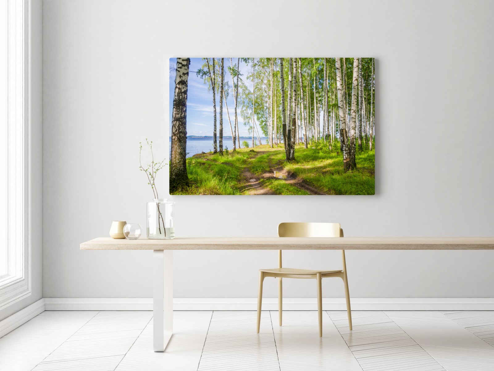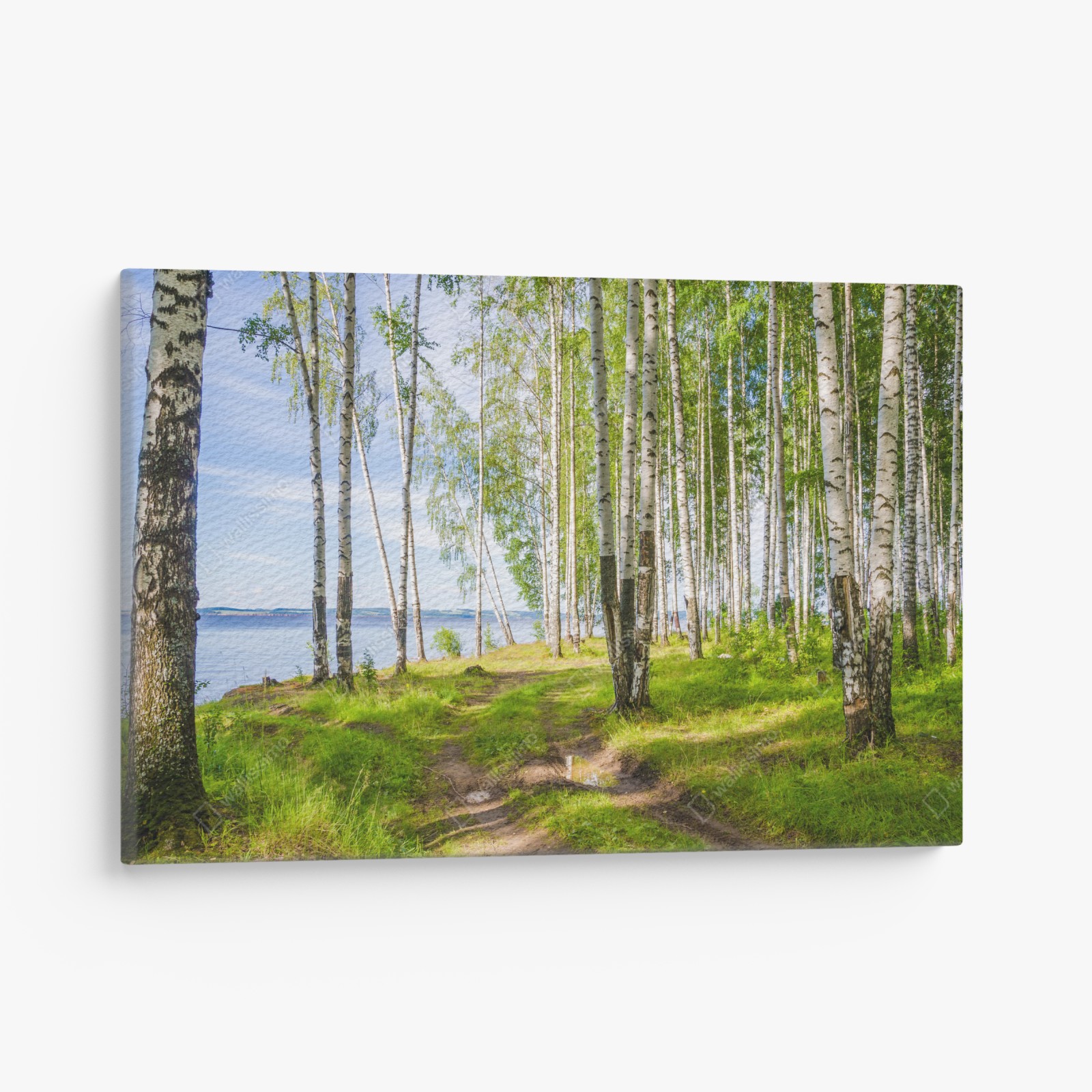 Obraz na płótnie Słoneczny zagajnik brzozowy nad wodą