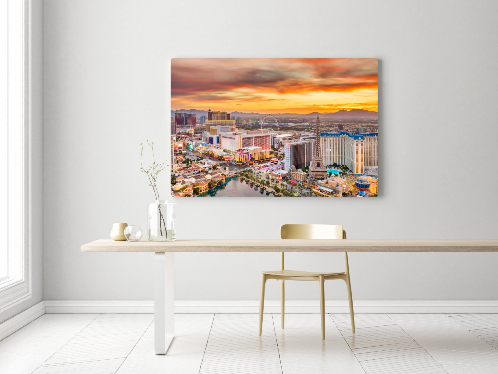 Wprowadź dynamiczną energię Las Vegas do swojego wnętrza dzięki tej imponującej fotografii panoramy miasta o zmierzchu.WięcejMniej