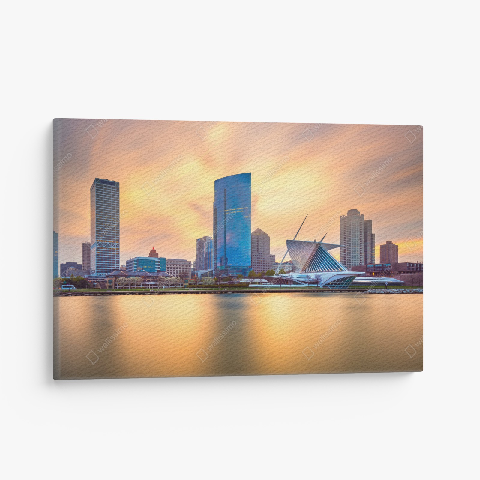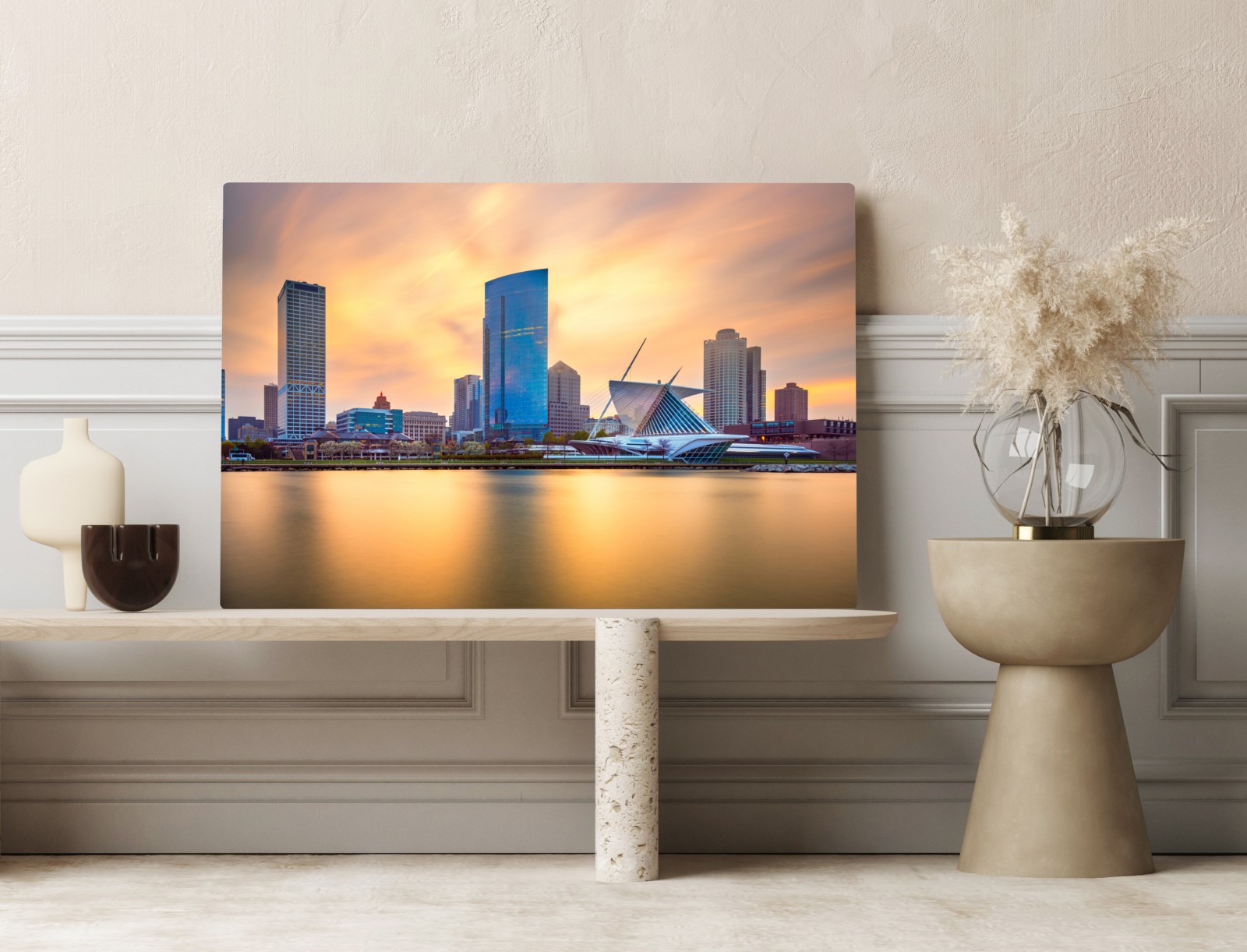 Odkryj złocisty blask panoramy Milwaukee o zmierzchu i wprowadź do wnętrza nowoczesny, nadbrzeżny klimat.WięcejMniej