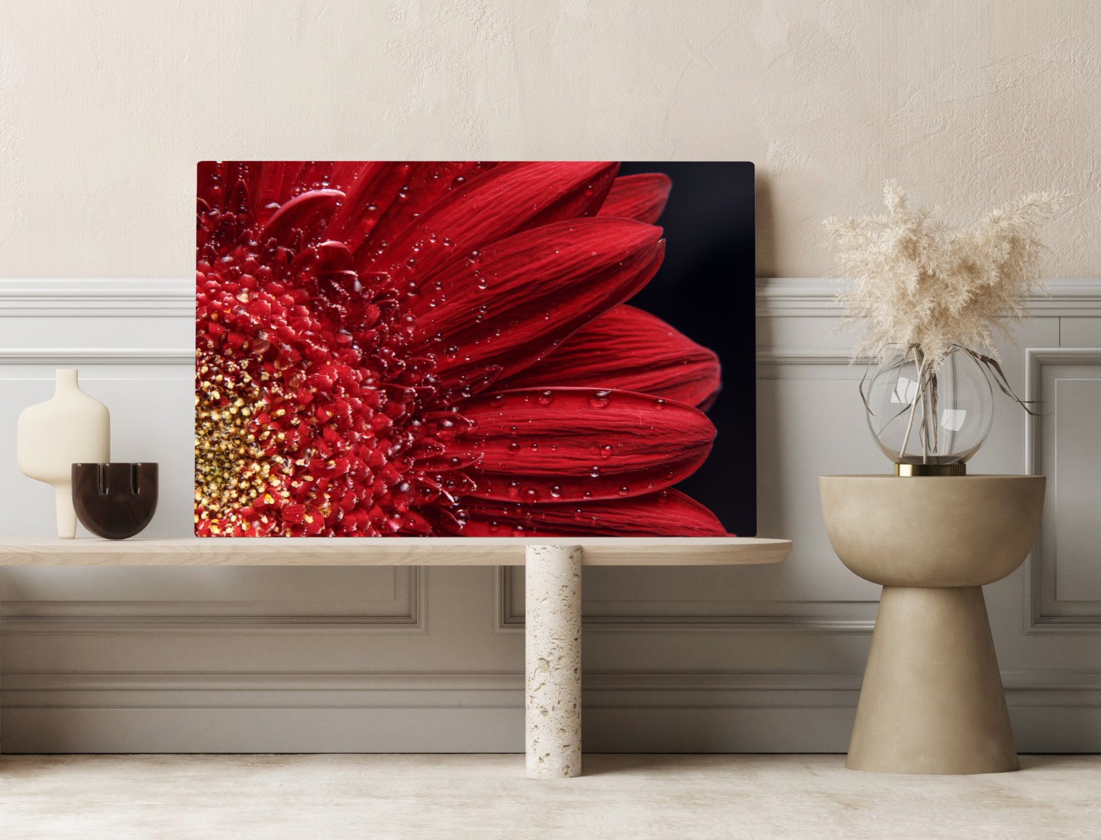 Obraz na płótnie Czerwona gerbera makro z kroplami rosy