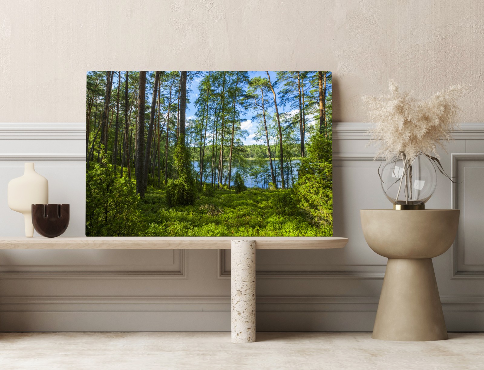 Obraz na płótnie Spokojny las sosnowy nad jeziorem
