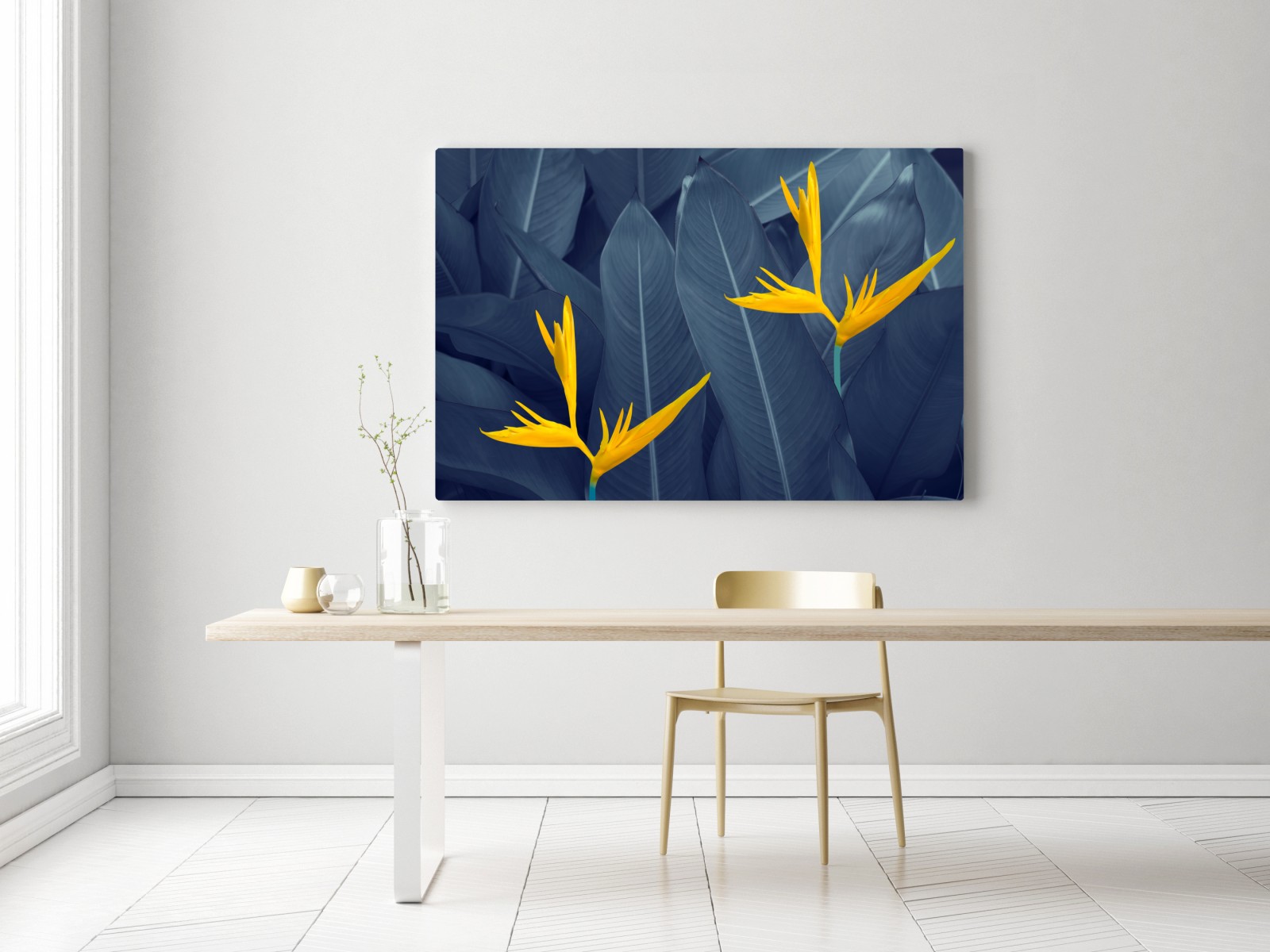 Obraz na płótnie Żółta strelicja na niebieskich liściach