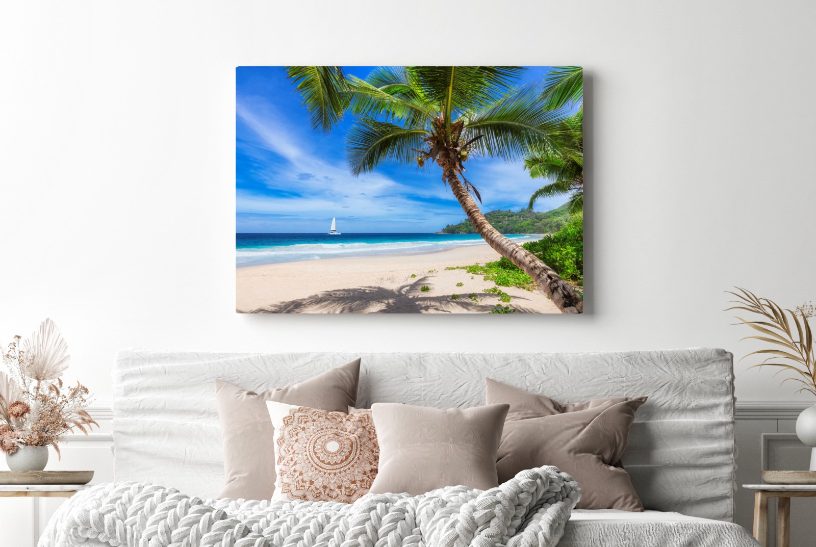 Wprowadź do wnętrza spokój tropikalnej plaży z widokiem na palmy i żaglówkę na horyzoncie.WięcejMniej