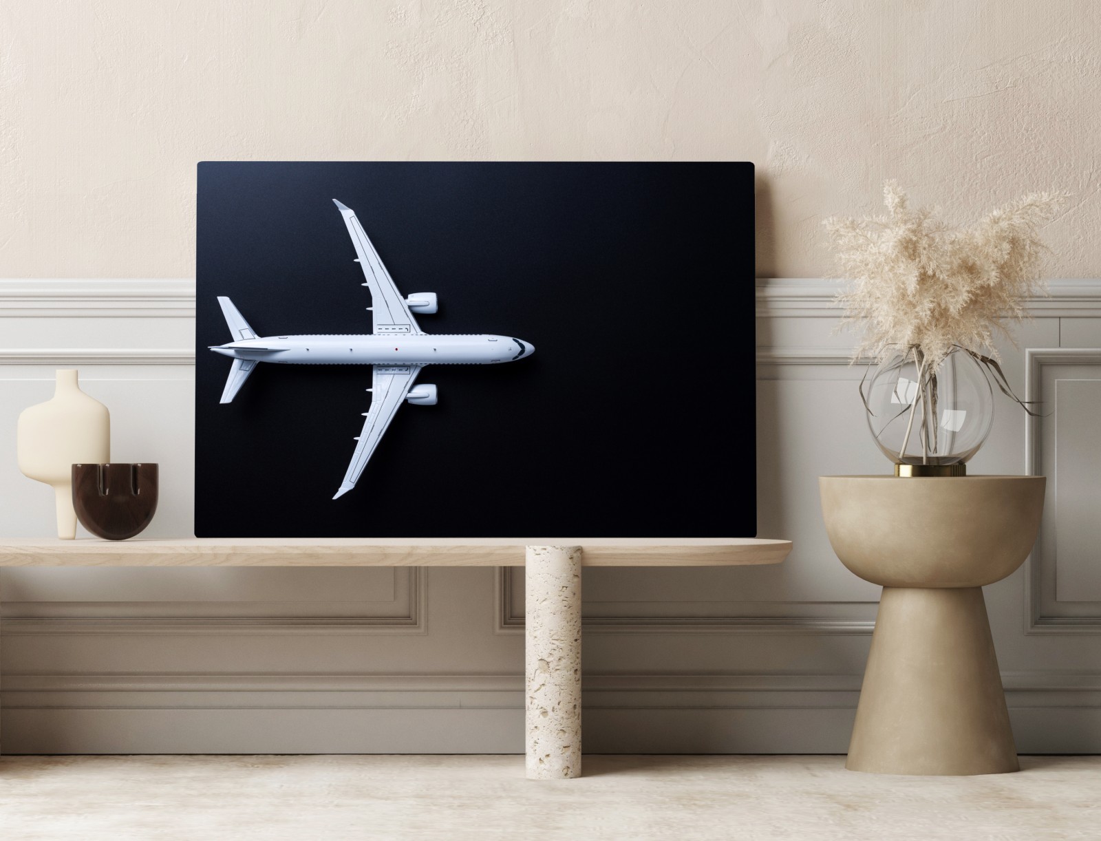 Obraz na płótnie Biały samolot widok z góry na czarnym tle