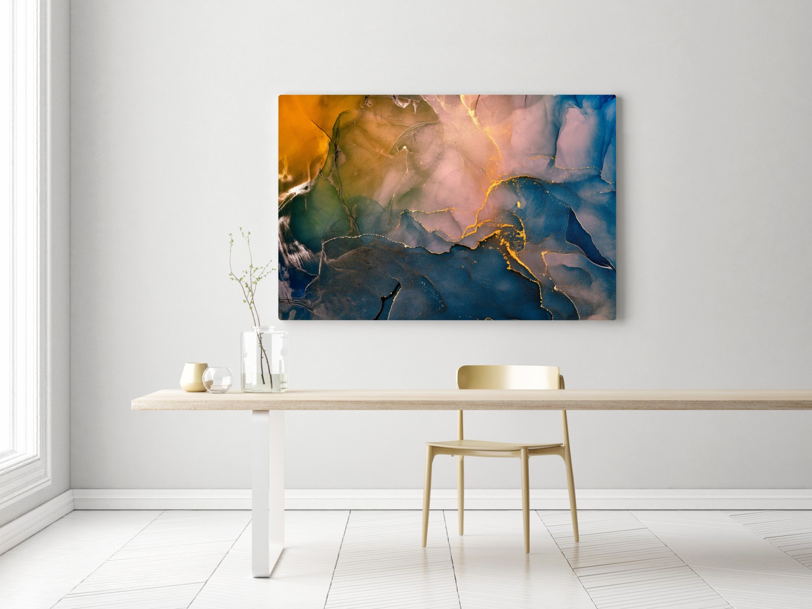 Dodaj głębi i nowoczesnej elegancji do wnętrza dzięki niebiesko-złotemu abstrakcyjnemu marmurowemu wzorowi.WięcejMniej