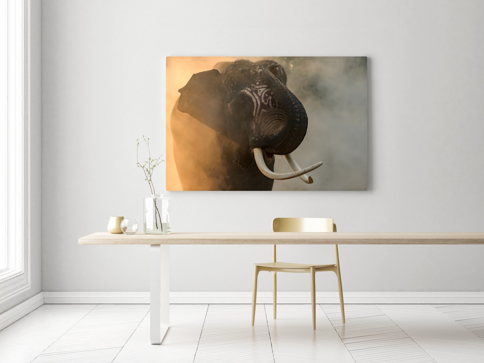Wprowadź dziką siłę Tajlandii do wnętrza dzięki portretowi słonia z kłami skąpanego w złotym pyle.WięcejMniej