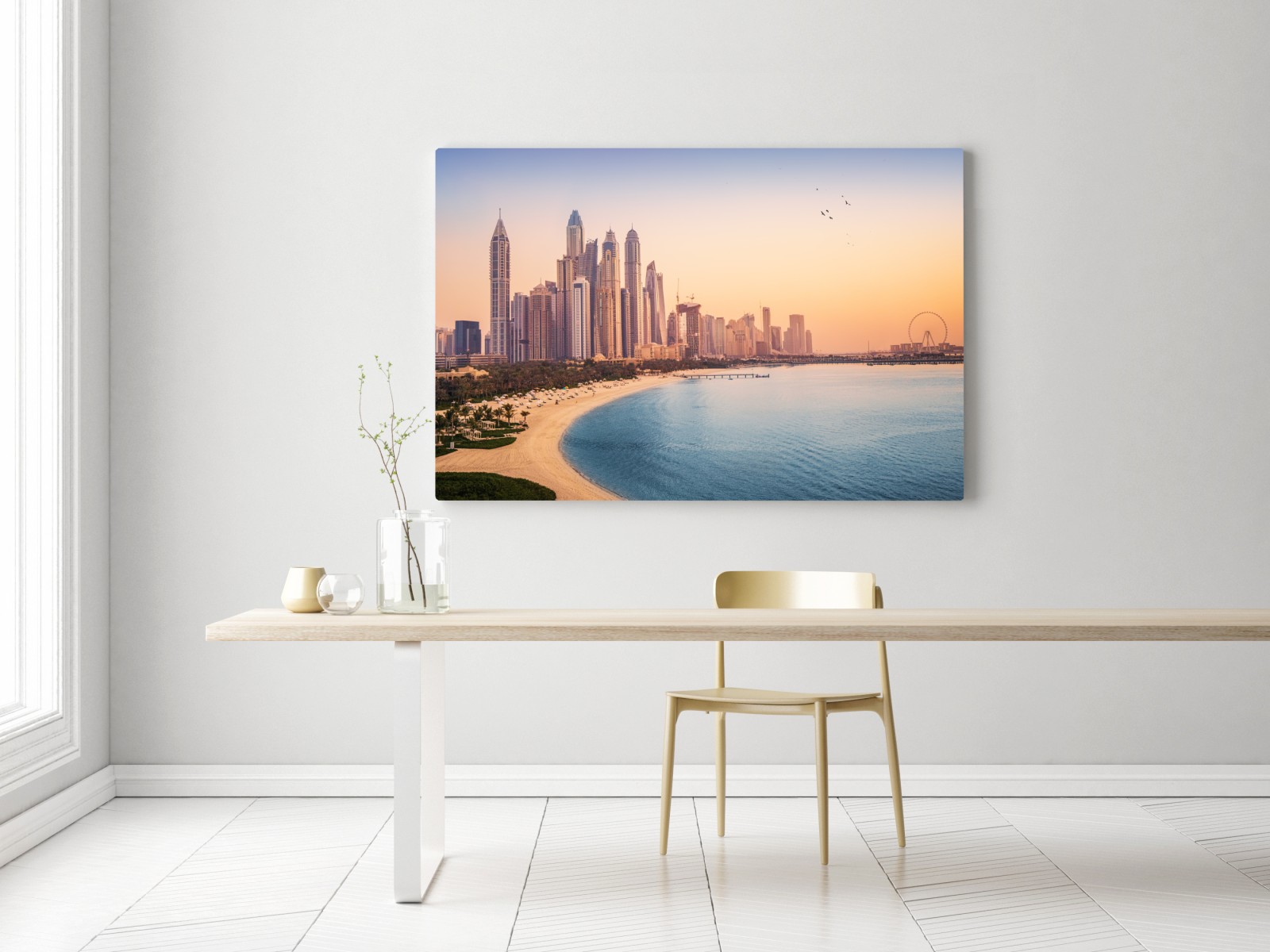 Obraz na płótnie Dubaj panorama miasta o zachodzie słońca