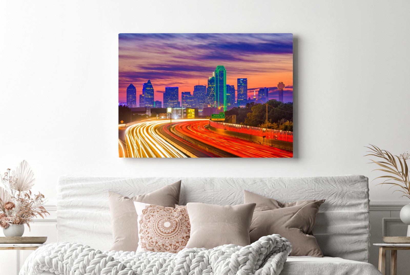 Obraz na płótnie Panorama Dallas o zachodzie słońca z świetlnymi smugami autostrady