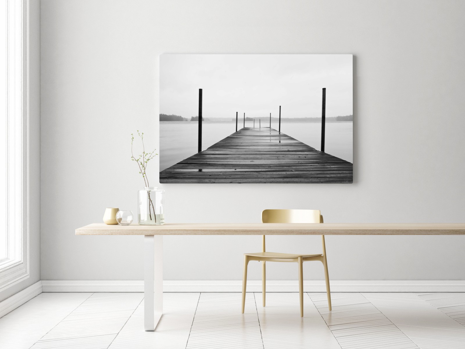 Obraz na płótnie Mglisty pomost nad jeziorem w monochromie