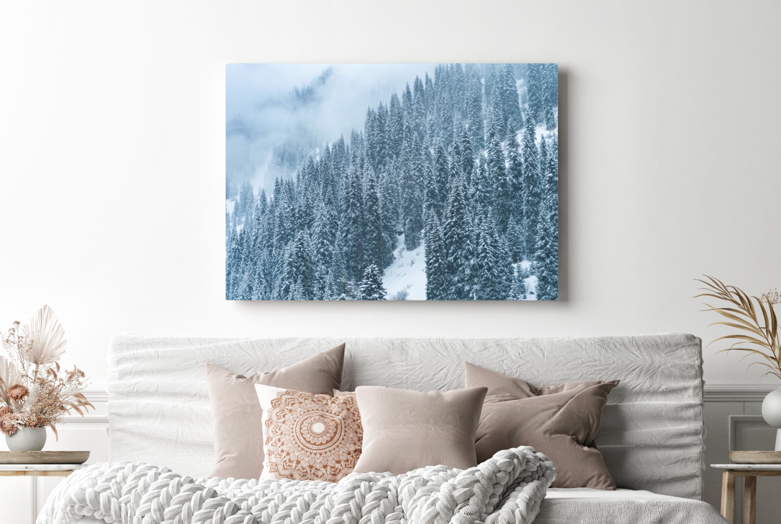 Obraz na płótnie Mglisty ośnieżony las sosnowy
