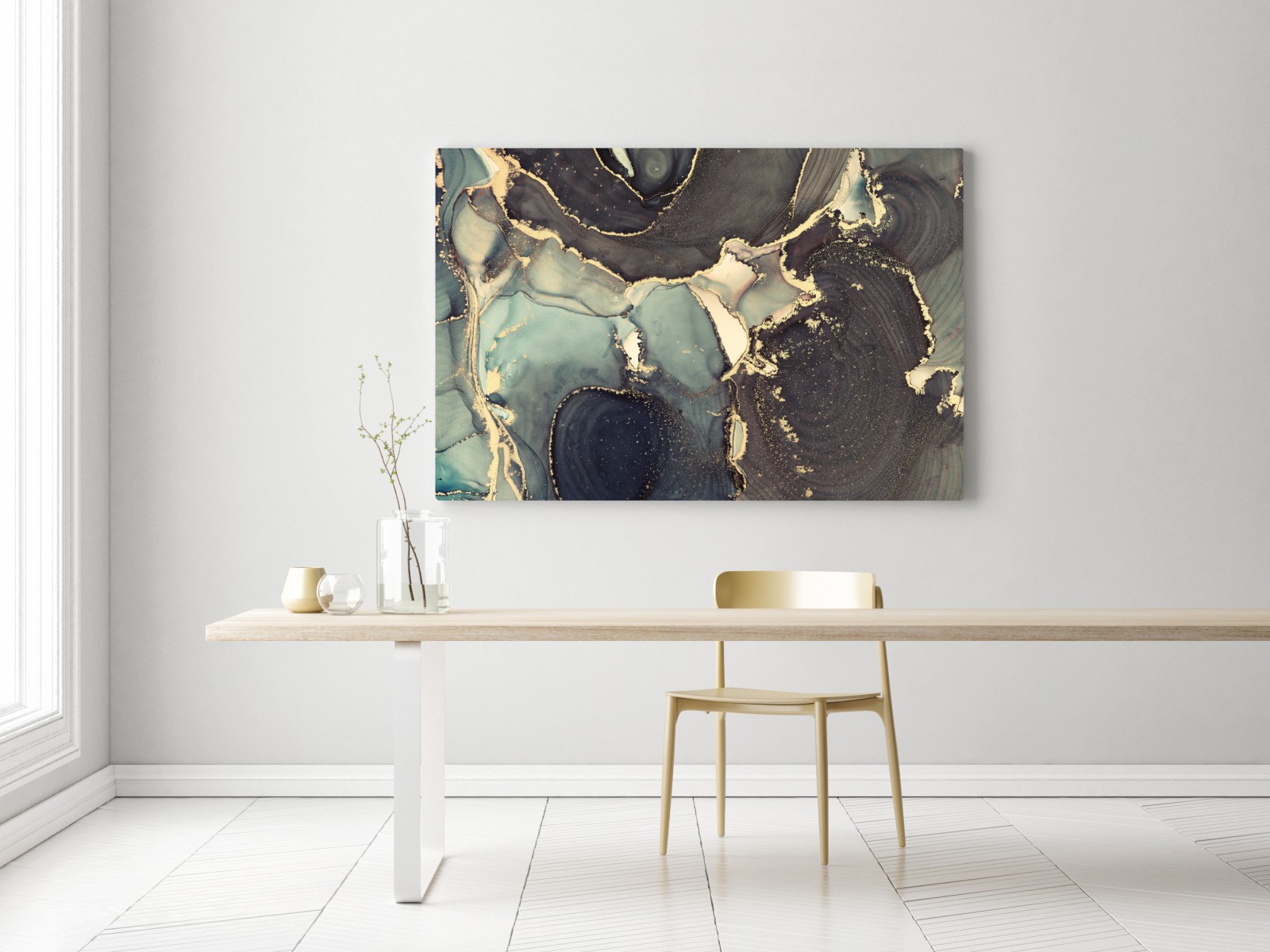 Elegancka turkusowo-złota abstrakcja wprowadza marzycielski, luksusowy nastrój do wnętrza.WięcejMniej