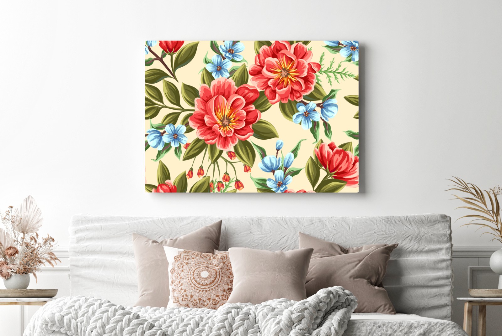 Dodaj botanicznego uroku do wnętrza dzięki intensywnemu akwarelowemu wzorowi kwiatowemu z czerwonymi i niebieskimi akcentami na beżowym tle.WięcejMniej