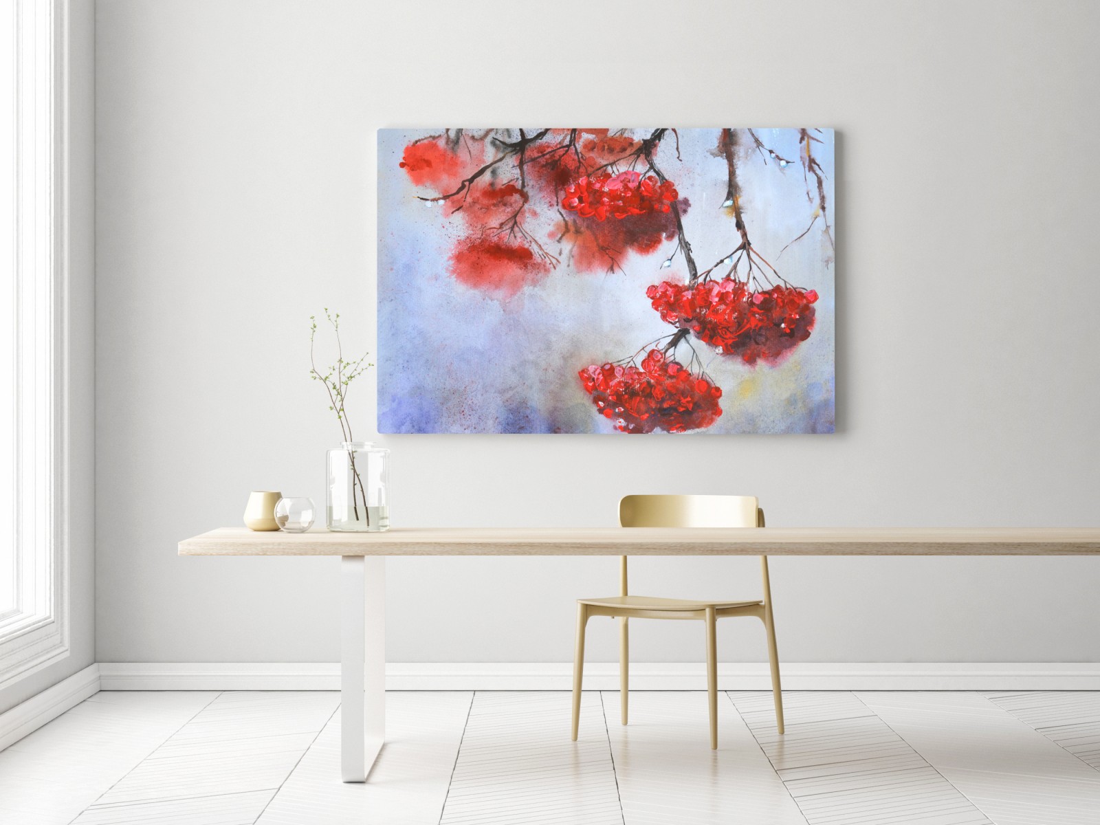 Wprowadź do wnętrza ciepło natury dzięki delikatnej akwareli z czerwonymi jagodami, idealnej do ozdobienia ściany subtelnym kolorem i sezonowym akcentem.WięcejMniej