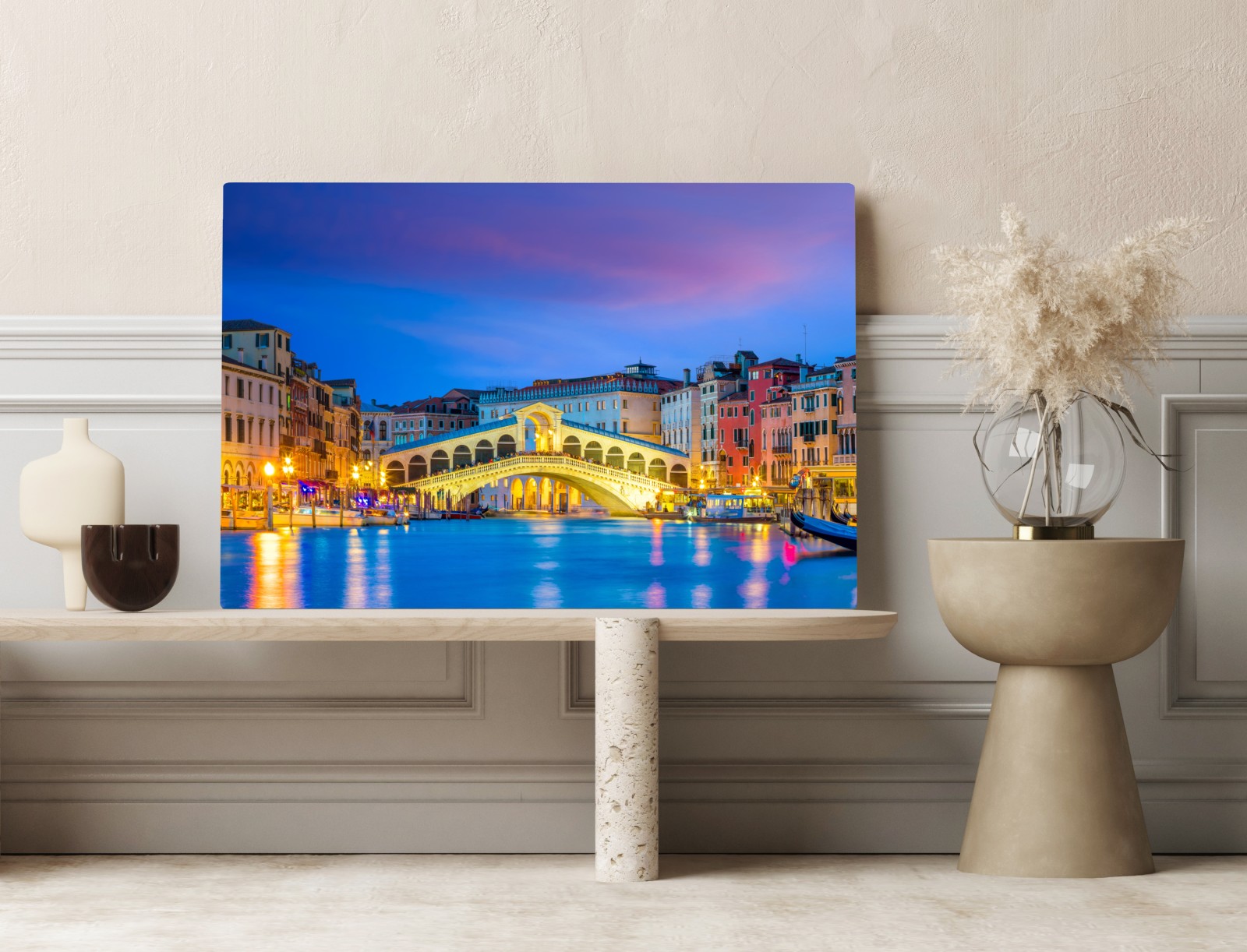 Dodaj do wnętrza magię zmierzchu w Wenecji z żywym widokiem na most Rialto i migoczące odbicia na kanale.WięcejMniej