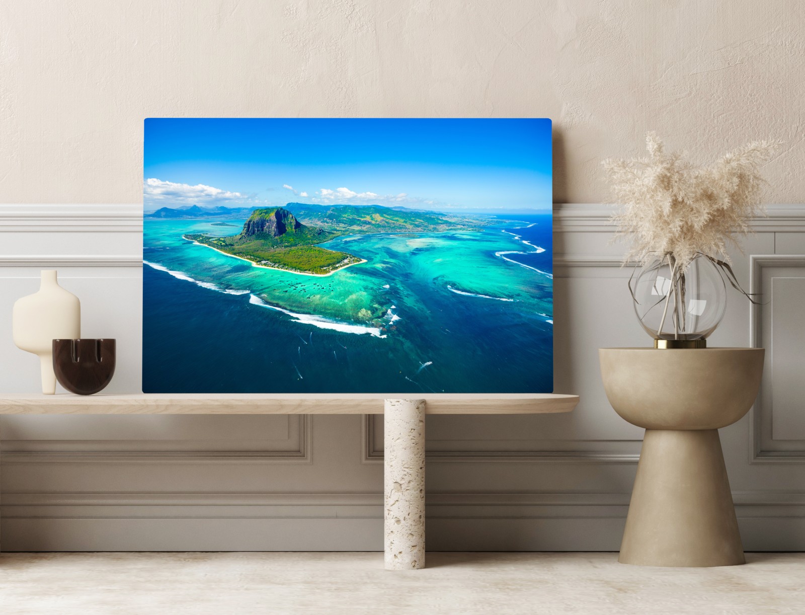 Dodaj tropikalny nastrój do wnętrza dzięki barwnemu ujęciu z lotu ptaka Le Morne i jego turkusowej laguny.WięcejMniej