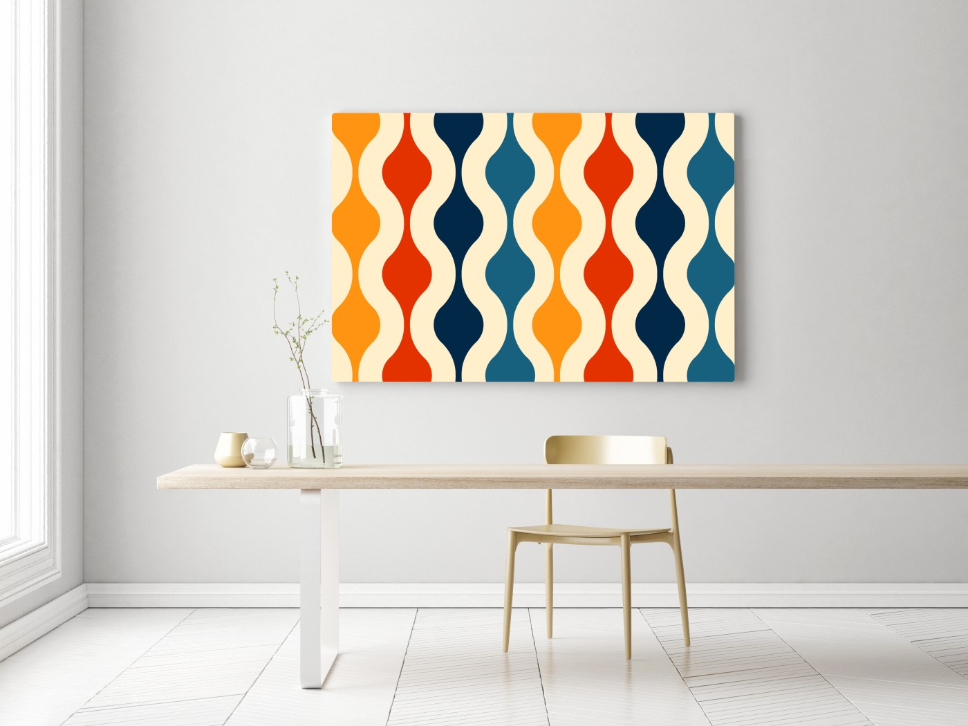 Dodaj wnętrzu retro charakteru dzięki wyrazistemu falistemu wzorowi w ciepłych odcieniach pomarańczowego, czerwonego, turkusu i granatu.WięcejMniej