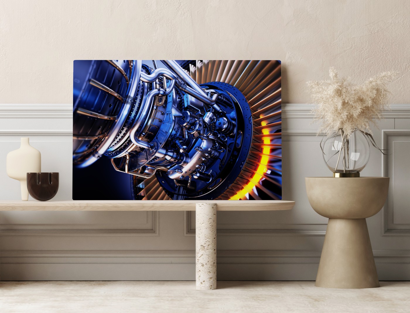 Obraz na płótnie Zbliżenie turbiny silnika odrzutowego w niebieskich i pomarańczowych tonach