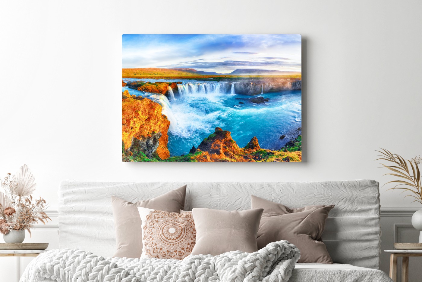 Obraz na płótnie Panorama wodospadu Godafoss o wschodzie słońca