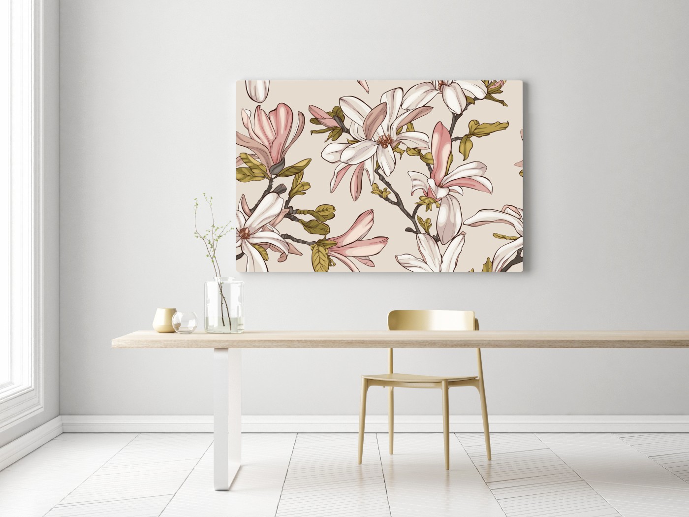 Delikatne kwiaty magnolii w miękkich pastelowych tonach wprowadzają uspokajający, botaniczny akcent do każdego wnętrza.WięcejMniej