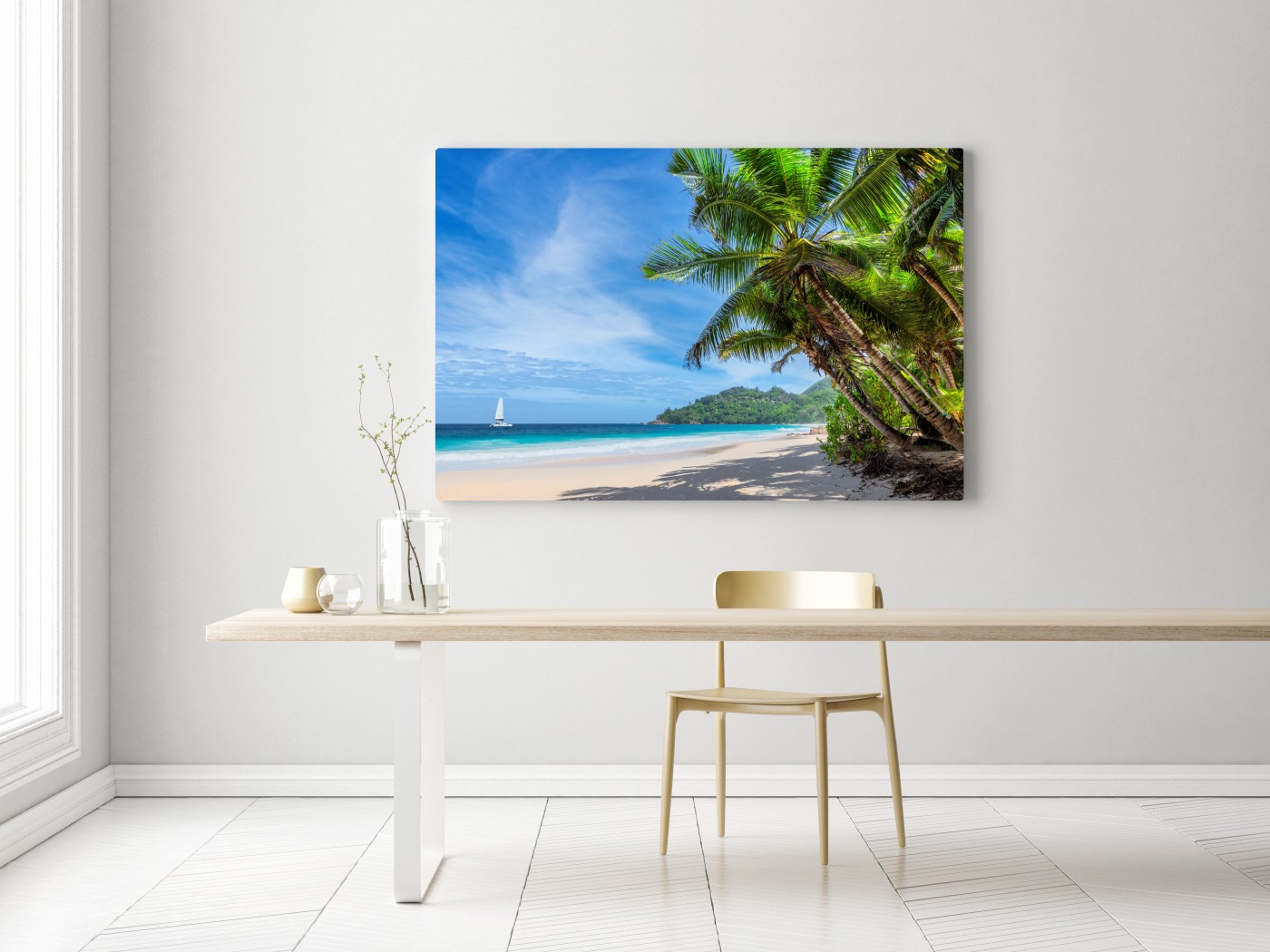Obraz na płótnie Tropikalna plaża z palmami i żaglówką