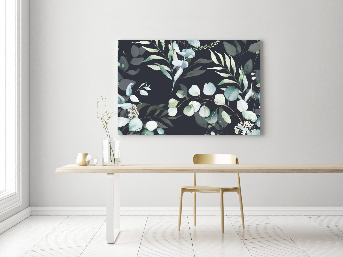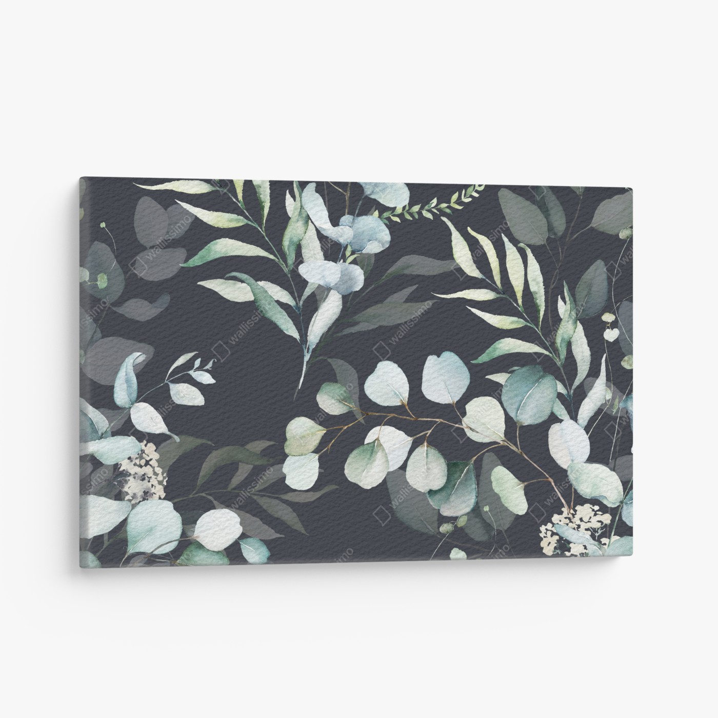 Wprowadź spokój i naturę do wnętrza dzięki akwarelowemu wzorowi eukaliptusa na głębokim grafitowym tle, idealny do sypialni w stylu skandynawskim.WięcejMniej