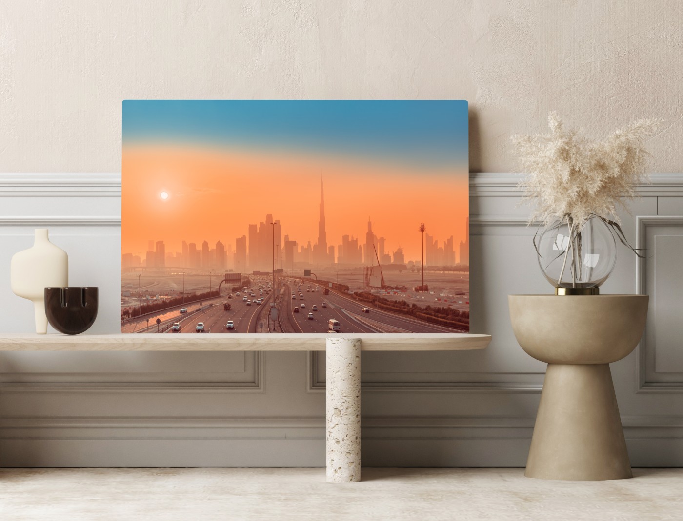 Poczuj spokojny blask wschodu słońca nad nowoczesną panoramą miasta, wprowadzający ciepłe tony i relaksującą atmosferę do każdego wnętrza.WięcejMniej