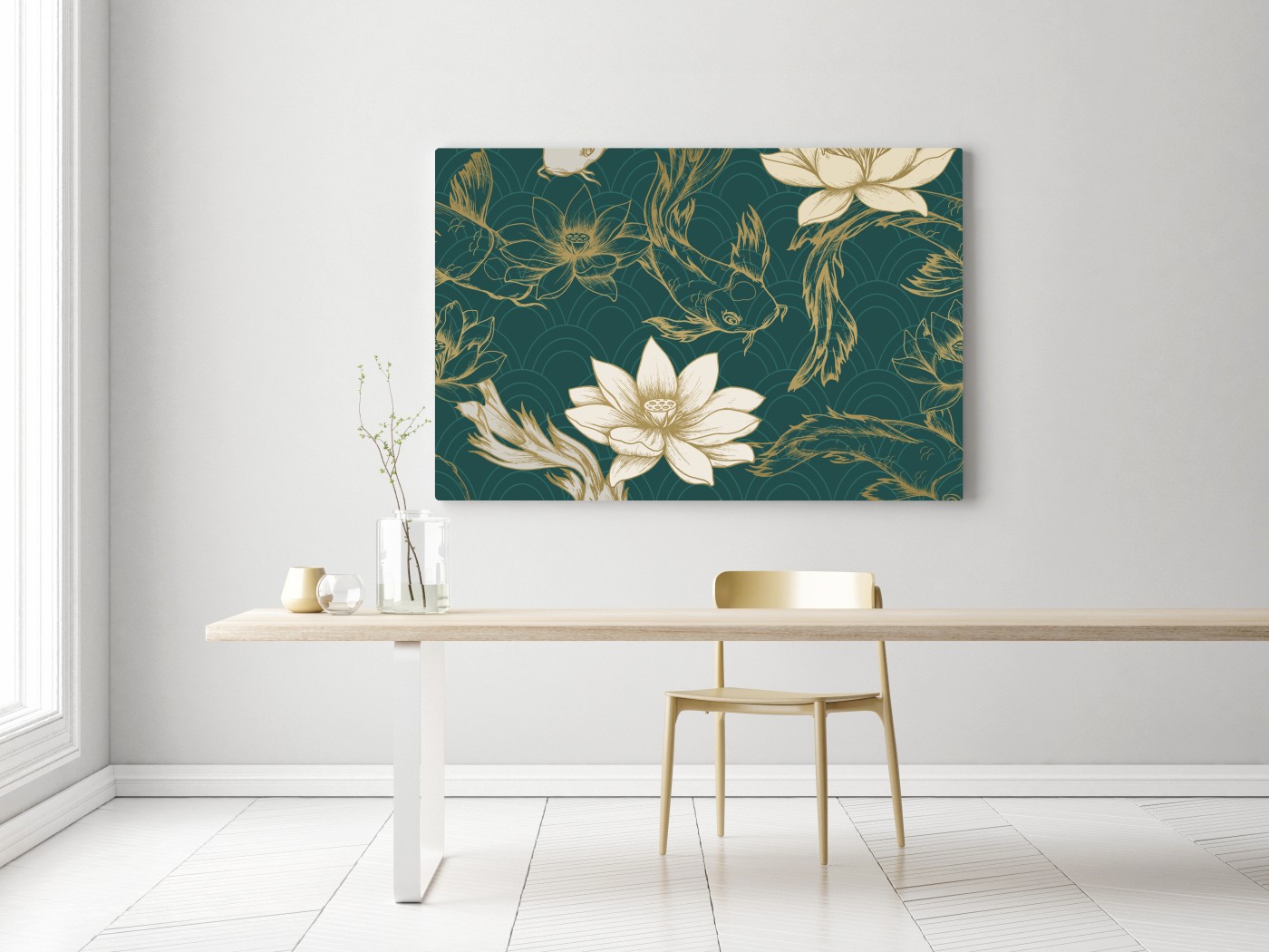 Obraz na płótnie Orientalny wzór koi i lotosów w turkusie i złocie