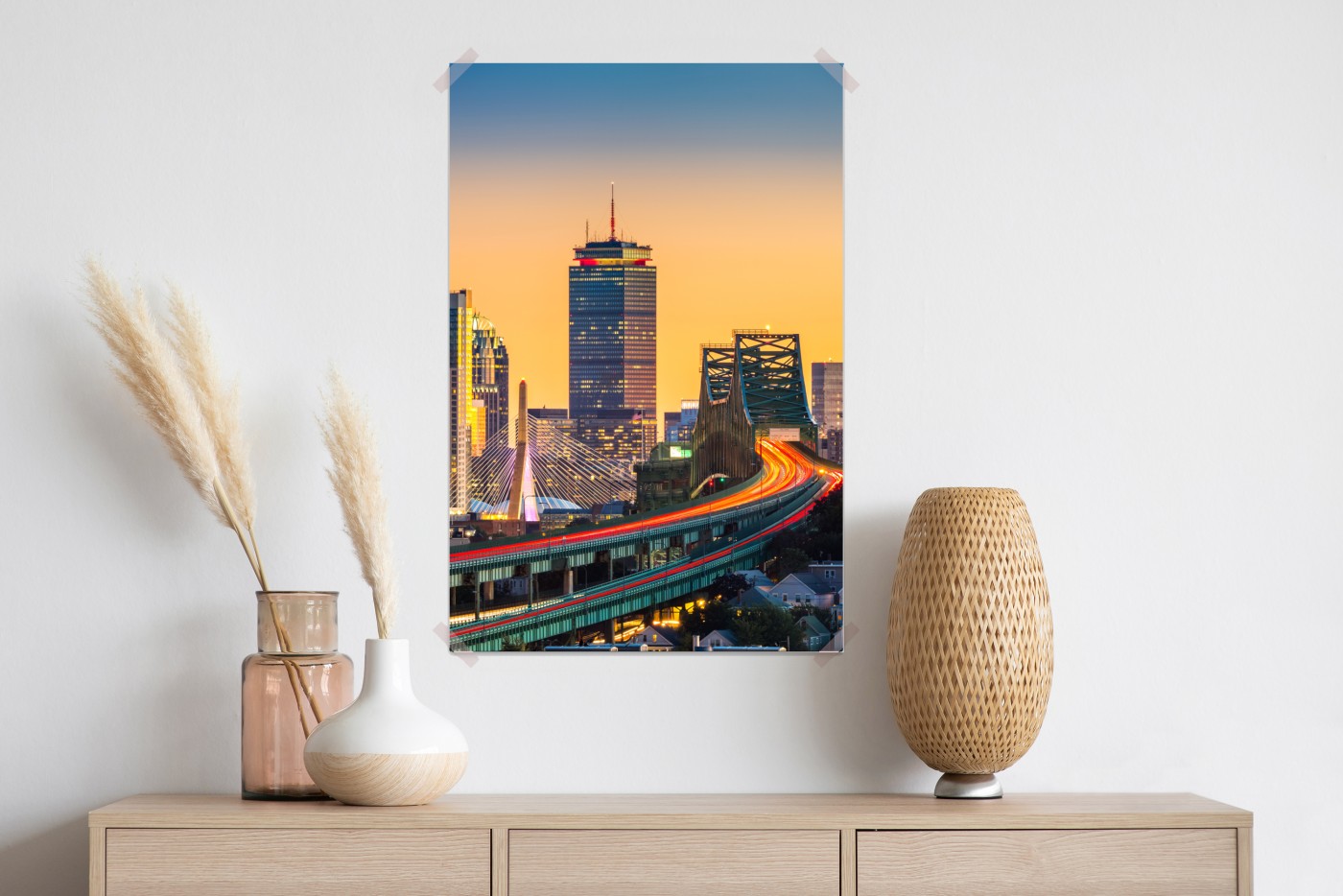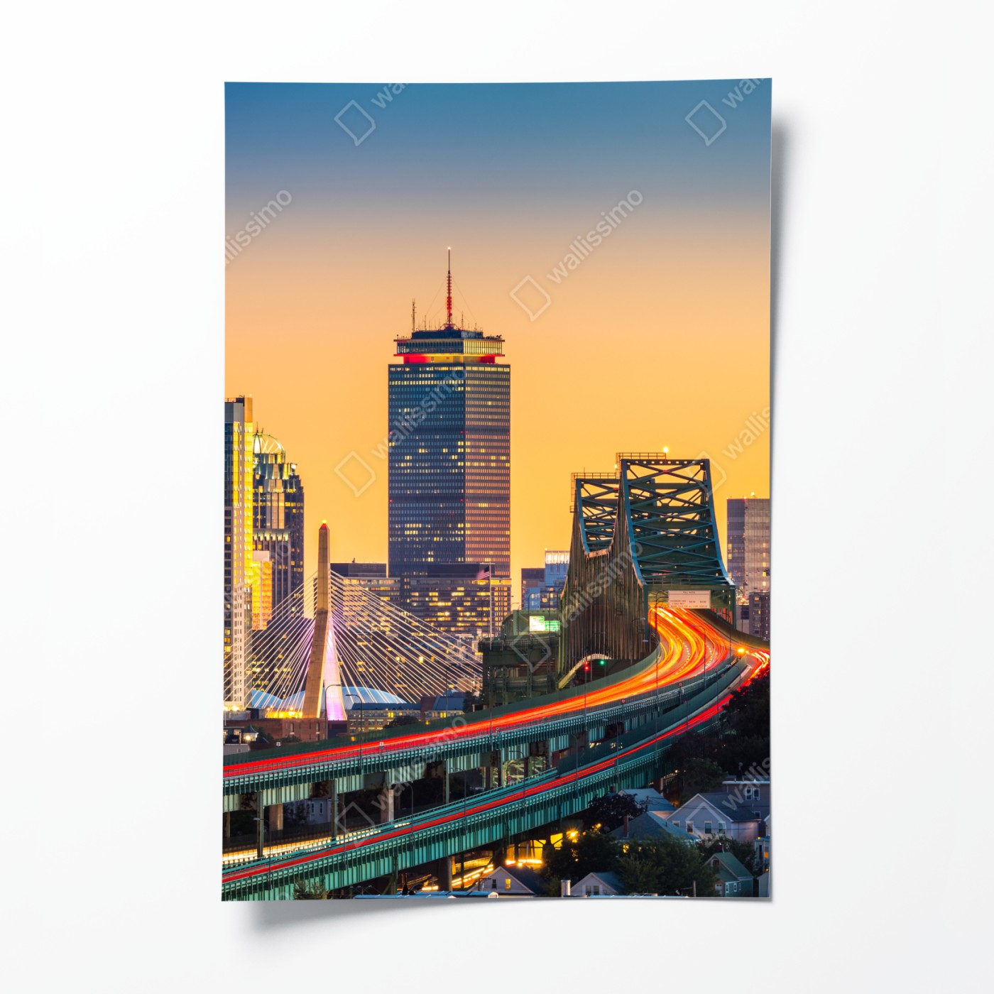 Plakat panorama Bostonu o zachodzie słońca z mostami Zakim i Tobin – Wallissimo®