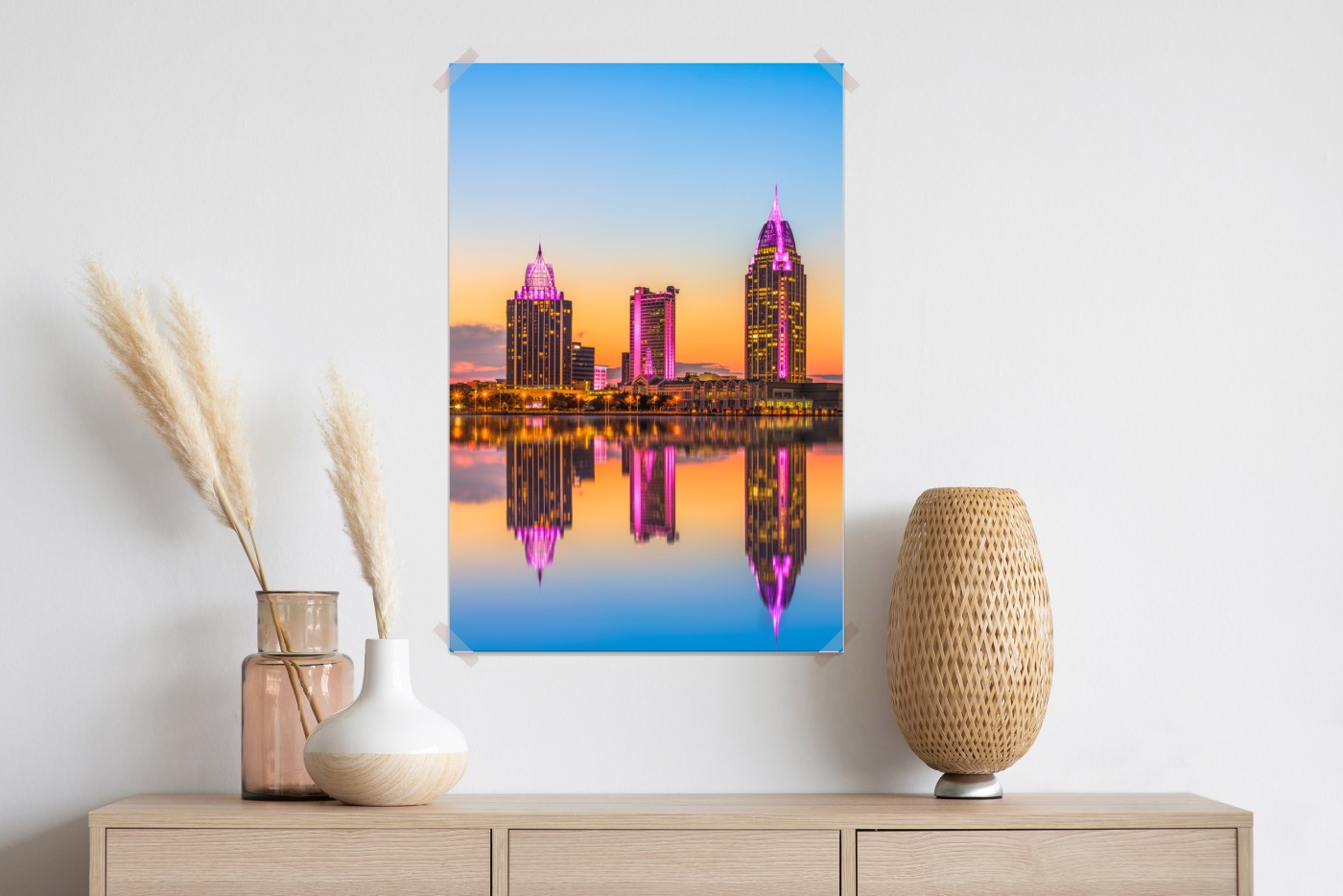 Wprowadź żywe światło przybrzeżnej panoramy Mobile do swojego wnętrza dzięki temu zachwycającemu miejskiemu pejzażowi o zachodzie słońca.WięcejMniej