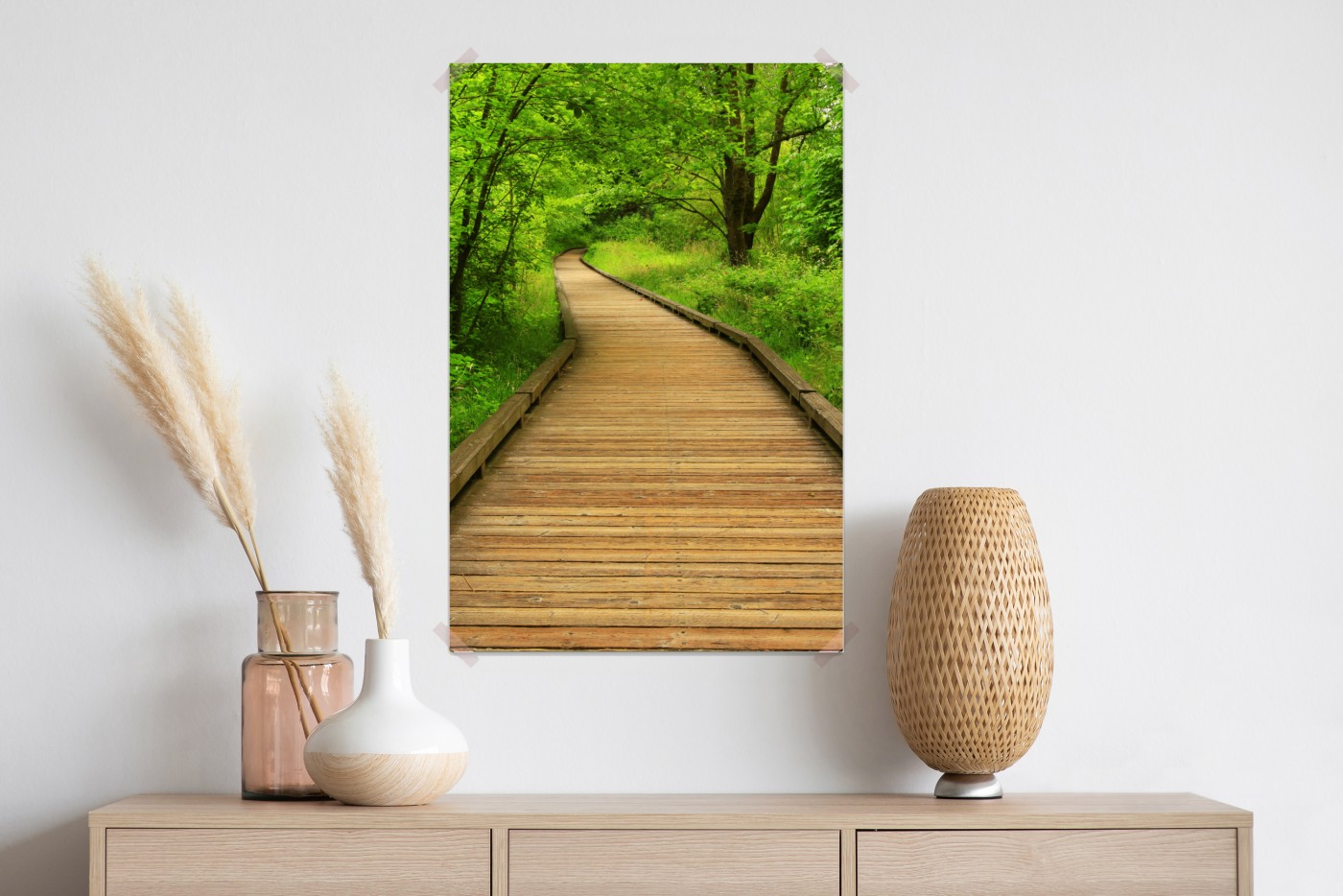 Wprowadź do wnętrza spokojną atmosferę lasu dzięki temu żywemu zdjęciu drewnianej ścieżki, idealnemu do relaksu i kontaktu z naturą.WięcejMniej