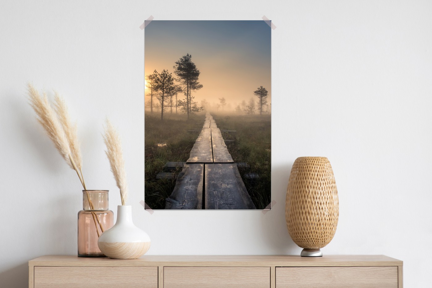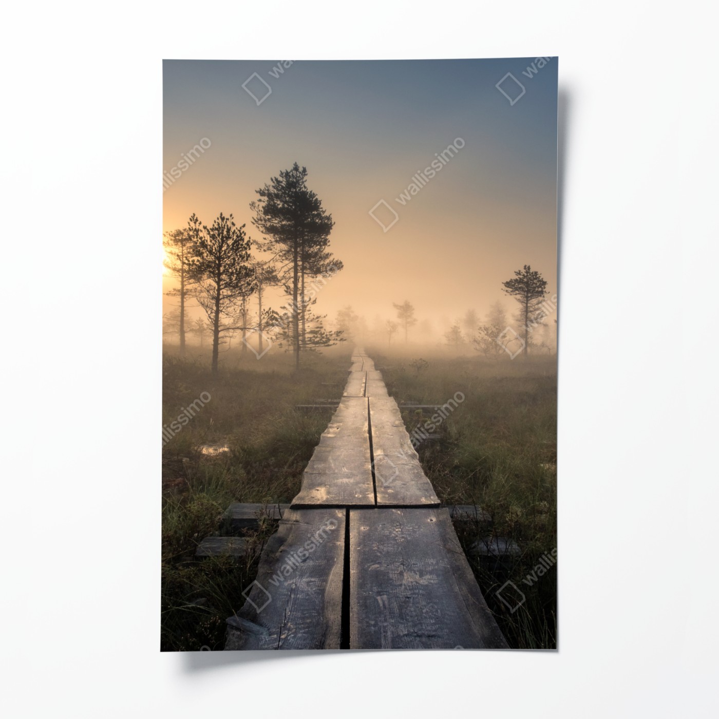 Plakat Mglisty wschód słońca nad drewnianą kładką